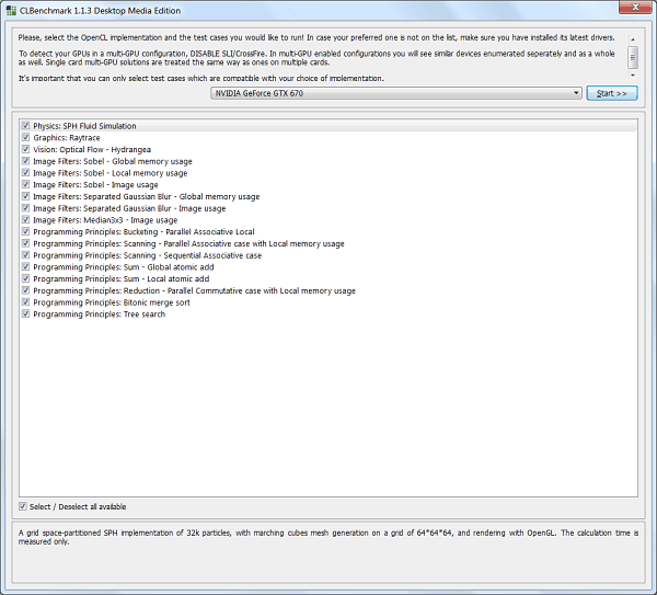 Найти подходящие OpenCL-бенчмарки не так просто, как может показаться. Некоторые тесты не работают на GPU одной из компаний (к примеру, FlopsCL не заработал на Geforce GTX 670), другие слишком сложны в использовании или не дают повторяемых результатов. А есть бенчмарки, в которых OpenCL применяется, но не для тестирования производительности. Например, в свежих версиях популярного пакета тестов AIDA64 существует стресс-тест, использующий OpenCL, но нет бенчмарков, позволяющих оценить скорость таких вычислений.