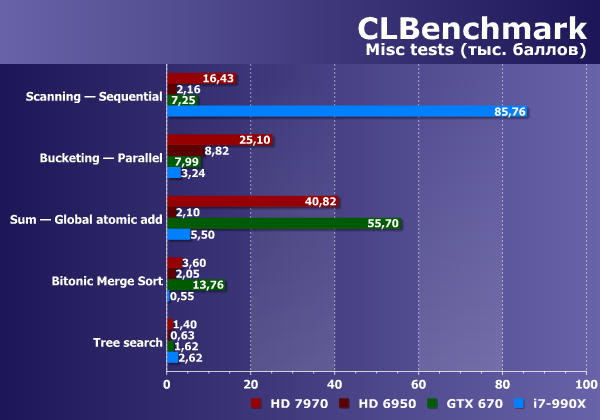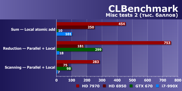 Оставшиеся тесты нужно рассматривать по отдельности. В основном, графические чипы в них выглядят сильнее, чем универсальный CPU, но есть нюансы. Так, при суммировании с использованием атомарных операций в глобальной памяти Geforce GTX 670 заметно быстрее всех остальных решений, в том числе и Radeon HD 7970 (а HD 6950 в этом тесте провалился ниже уровня CPU), зато в алгоритме с использованием локальной памяти ситуация меняется на обратную, и GPU Nvidia проваливается далеко вниз, до 10 раз уступая даже универсальному процессору. Надо отметить, что Radeon HD 7970 в обоих вариантах смотрится очень неплохо.