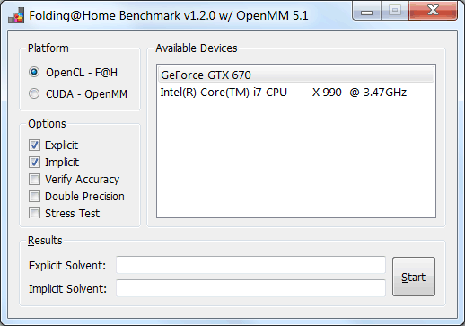 Бенчмарк FAHBench предназначен для измерения производительности графических процессоров в столь сложной вычислительной задаче, он позволяет сравнить производительность CPU и GPU, причем для видеокарт компании Nvidia доступны два метода: OpenCL и CUDA. К сожалению, с CUDA-вариантом возникли какие-то проблемы, и тестирование просто не запускалось, поэтому пришлось ограничиться OpenCL-версией. К слову, FAHBench также не работает и на старых встроенных видеоядрах Intel по причине отсутствия поддержки ими вычислений с двойной точностью.