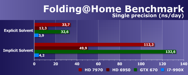Если до этого мы рассматривали целые тестовые пакеты, содержащие множество различных задач, то FAHBench очень прост — он измеряет производительность в единственной узкоспециализированной задаче. Интересны цифры нашего тестового CPU: при explicit- и implicit-методах моделирования результаты почти одинаковы, разница не превышает 10%.