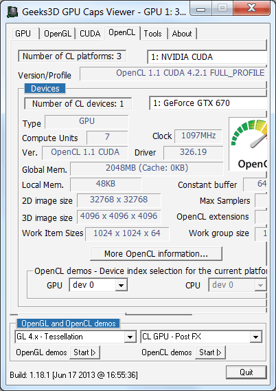 Тест с миллионом обрабатываемых частиц лучше всего выполняет Geforce GTX 670, а вот оба Radeon его провалили — налицо какая-то ошибка, то ли драйвера, то ли OpenCL-компилятора, из-за которой ими был показан аномально низкий результат. Так что если GPU Caps Viewer и можно использовать при OpenCL-тестировании, то лишь некоторые из демо-программ, и с оговорками.