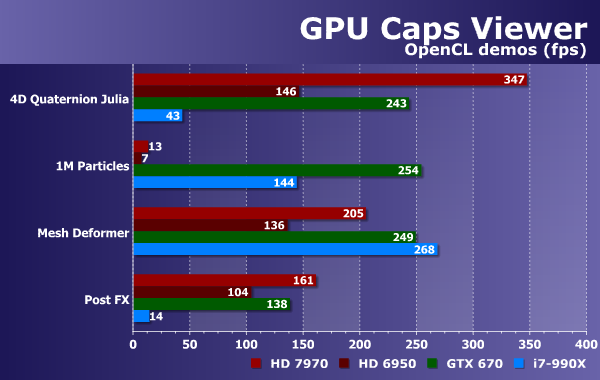 Также утилита содержит несколько демонстрационных программ, использующих возможности OpenGL 3.2 и OpenCL, а вот как таковых тестов производительности OpenCL в ней (пока что?) нет. Но это не беда, можно просто использовать число кадров в секунду, получаемое при рендеринге в демонстрационных программах, использующих OpenCL-вычисления. В состав GPU Caps Viewer входят четыре такие «демки»: объемный (в трех измерениях) фрактал множества Julia, использующий трассировку лучей; объемная система частиц, состоящая из одного миллиона штук; сложная объемная поверхность, деформируемая при помощи OpenCL; и довольно простой эффект постобработки.