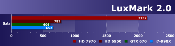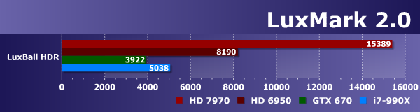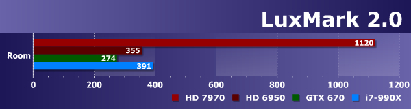 В данном бенчмарке явно есть некая специфическая оптимизация под графические процессоры компании AMD. И особенно заметно выделяется по результатам тестов современная графическая архитектура GCN, которая отлично подходит для выполнения подобных OpenCL-задач. Да и универсальный процессор Intel неплохо себя показал в этом бенчмарке, всегда обгоняя Geforce GTX 670, а иногда и Radeon HD 6950. Видимо, код распараллелен не слишком эффективно или используются какие-то возможности OpenCL, которые плохо работают на некоторых GPU. Ниже мы сравним полученные результаты с другим тестом, также использующим трассировку лучей и сложные 3D-сцены. На наш взгляд, если и использовать LuxMark, то только как один из OpenCL-тестов, но явно не единственный.