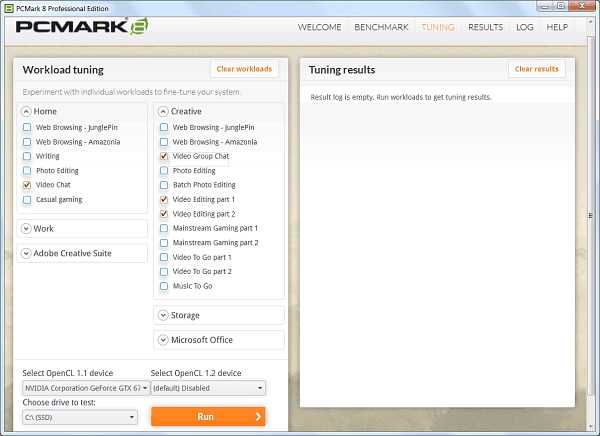 Пакет тестов PCMark 8 компании Futuremark является последней версией широко распространенного бенчмарка для измерения общей производительности ПК. PCMark 8 можно назвать одним из наиболее полных тестов производительности, включающим разнообразные подтесты. Пакет обеспечивает режимы нагрузок, отражающие типичные задачи пользователей домашнего компьютера, такие как просмотр веб-страниц, редактирование текстов, игры, редактирование изображений, а также видеочаты. Раздел «Creative» данного пакета содержит уже более сложные задачи для продвинутых пользователей, которые дополнены сложным редактированием фотографий и видеоданных, включая их перекодирование из формата в формат, а также групповым видеочатом.