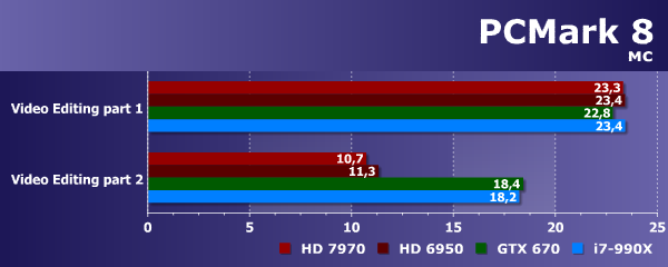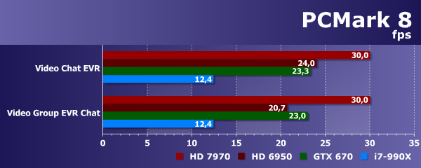 В подтестах видеочата разница в скорости больше похожа на правду, и тут не используется OpenCL 1.2, поэтому сравнение честное. Все графические процессоры в 2-2,5 раза быстрее универсального процессора Intel Core i7-990X, но Radeon HD 7970 явно мощнее всех — только этот GPU обеспечил 30 FPS в обоих подтестах. Оставшиеся Radeon HD 6950 и Geforce GTX 670 весьма близки друг к другу в этом бенчмарке, но они не дотягивают до 30 FPS.