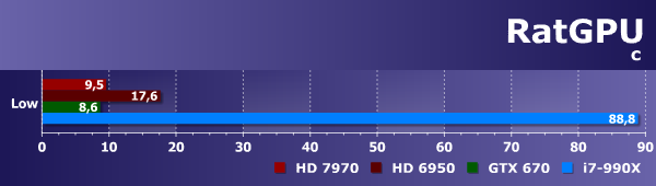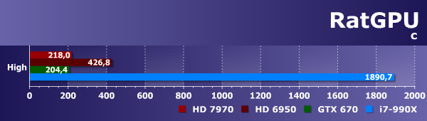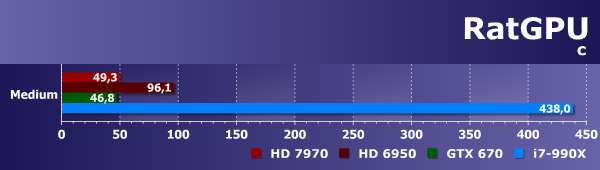 Любопытно, но Geforce GTX 670 показал результат лишь на уровне Radeon HD 6950. Более свежая же видеокарта AMD более чем вдвое быстрее этой парочки. Ну а универсальный процессор тестовой системы, даже такой достаточно мощный шестиядерник, как Intel Core i7-990X, очень сильно уступил даже решению Nvidia, не говоря уже о лучшем GPU этого теста — Radeon HD 7970.