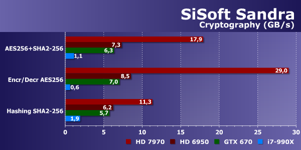 От пиковой синтетики переходим к тестам, приближенным к реальности. Первым таким тестом в Sandra является определение скорости криптографических расчетов — кодирования и декодирования данных. В таких задачах GPU всегда показывают себя с лучшей стороны, и особенно это касается современного решения компании AMD — Radeon HD 7970. Графические процессоры архитектуры GCN наиболее производительны в задачах со множеством целочисленных расчетов.