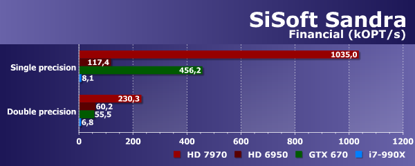 С самого начала тестирования в Sandra можно было предположить, что лидером во всех этих задачах станет Radeon HD 7970. Так и получилось: результат видеокарты Geforce GTX 670 оказался хоть и заметно лучше, чем у старой Radeon HD 6950 при расчетах одинарной точности, но и она более двух раз уступила топовой плате AMD. А уж при двойной точности расчетов проигрыш платы Nvidia и вовсе стал плачевным — разница составила более четырех раз, и ее слегка обогнала даже Radeon HD 6950. Давно известно, что игровые видеокарты Nvidia не слишком хороши при FP64-расчетах, если это не GTX Titan, конечно.