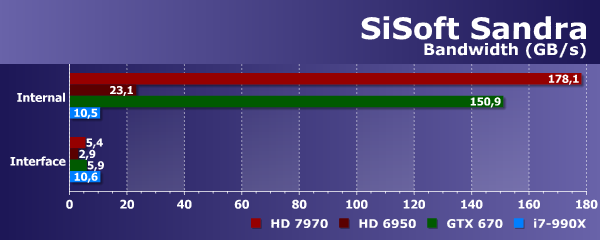 Которые, к слову, для внешней памяти (PCI-E) показали схожие результаты, а вот реальная ПСП локальной памяти у Radeon HD 7970 выше, чем у Geforce GTX 670. В тесте Sandra получилось 178 ГБ/с против 151 ГБ/с (при теоретических 264 и 192 ГБ/с соответственно), то есть у платы Nvidia эффективность использования шины памяти несколько выше. Логично, что скорость системной DDR3-памяти тестового ПК оказалась почти вдвое больше, чем скорость интерфейса, по которому подключены графические процессоры — в данном случае у CPU есть явное преимущество. Впрочем, как раз тут нам бы помогла поддержка PCI-E 3.0, которой у тестовой системы нет.