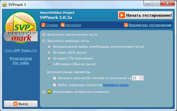Нас интересует то, что пакет SVP использует вычислительные способности современных графических процессоров, поддерживающих OpenCL — они применяются для снижения нагрузки на CPU и повышения качества итоговой картинки. Тестовый пакет SVPmark позволяет определить, нужно ли использовать в работе ускорение на GPU или нет, и включает следующие группы тестов: синтетические тесты для CPU (четыре теста) и GPU (три теста), реальные тесты в виде сценариев Avisynth на тестовых видеофрагментах заданного разрешения и измерение времени их исполнения. Естественно, мы использовали максимально возможное разрешение Full HD и OpenCL-ускорение: