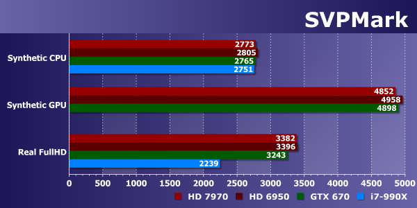 Ну и последним тестом OpenCL-производительности у нас будет SVPmark. Он позволяет оценить скорость вычислений при использовании алгоритмов, применяющихся в пакете SmoothVideo Project (SVP). SVP позволяет просматривать видеоданные на ПК с увеличением плавности видеоряда, которая обеспечивается добавлением в него кадров, содержащих интерполированную информацию о промежуточных положениях объектов.