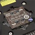 Теперь про изюминку карты компании MSI. С оборотной стороны в центре карты, прямо напротив ядра установлен этакий «набалдашник», который делает карту в целом шире (выше в списке характеристик ширина карты показана БЕЗ учета этого элемента, так как он расположен сзади и не влияет на то, сколько слотов занимает карта в целом). Поэтому следует это учитывать, так как есть системные платы, у которых радиаторы чипсетов расположены прямо перед первым слотом PCI-E, и видеокарта с таким расширением может просто физически не уместиться.