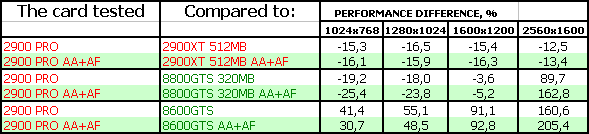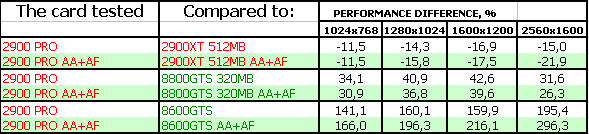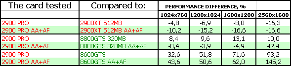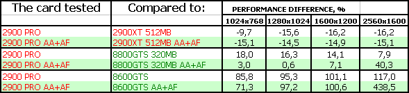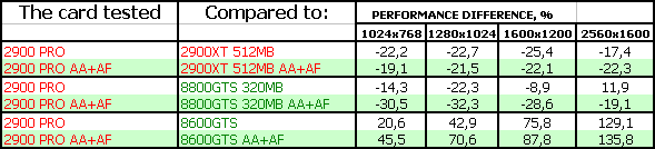 Тесты показали, что в львиной доле случаев отставание 2900 PRO от своего старшего собрата идет почти в прямой пропорции от разности в частоте ядра, поскольку частоты по памяти мало отличаются. Но есть и исключения. Например, можно заметить, что кое-где для 2900 PRO провели некую оптимизацию в драйверах, и, например, в пресловутом режиме с АА, где у 2900 XT все плохо, у 2900 PRO ситуация лучше, и даже были моменты обгона своего старшего собрата. Да, такие коллизии могут преподносить ошибки в самом GPU и залатывание их через драйвер.