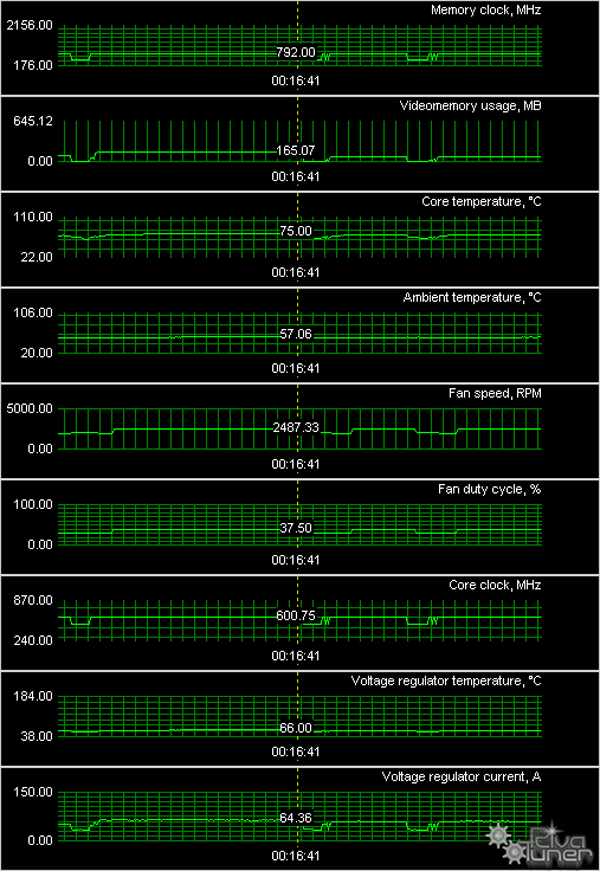 Дискретность установки процентов работы турбины весьма велика, и вы сможете выставить только или 31% или 37% (все новые версии RT позволяют это сделать). Отсюда вывод, что 37% — необходимый минимум работы кулера, при котором нет перегрева ядра. Ниже — уже нельзя. То есть разработчики в данном случае не перестраховывались, они реально выставили по-умолчанию работу кулера в 3D на минимально уровне, при котором нет перегревов. И этот уровень нельзя назвать тихим. Это большой минус у нового ускорителя. В качестве небольшого утешения: шум идет от потока воздуха, а не от турбины, поэтому его частота не так сильно раздражают слух.