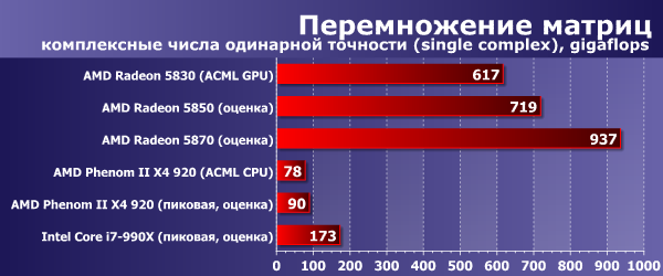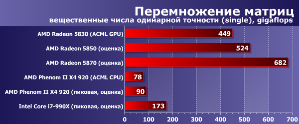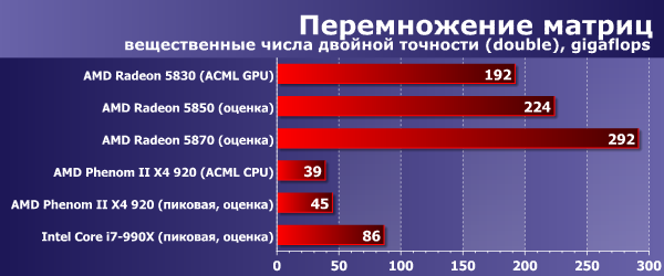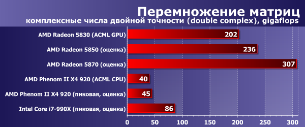 Что ж, даже младшая видеокарточка из серии Radeon 58xx демонстрирует производительность примерно в 5 раз большую, чем пиковая мощность современных настольных CPU (и в 2,5 раза большую, чем пиковая мощность топовых настольных CPU). Надо отметить, что ACML CPU очень хорошо оптимизирована и выдает очень близкие к теоретически возможному пику результаты. А вот ACML GPU ещё далека от теоретического максимума GPU, который составляет примерно полтора терафлопса в случае Radeon HD 5830. Собственно, версия для Radeon Evergreen вышла всего несколько месяцев назад, ее производительность ещё возрастет, тем более что сейчас она тормозится несовершенным драйвером Windows. А вот производительности CPU уже расти некуда: на этой (на самом деле, выгодной для демонстрации вычислительных возможностей процессоров) задаче и так удалось выжать практически всю доступную скорость. Можно ещё раз отметить, что в данном случае учитывается также время копирования данных в память видеокарты и результата обратно, то есть это реальная конечная производительность GPU.