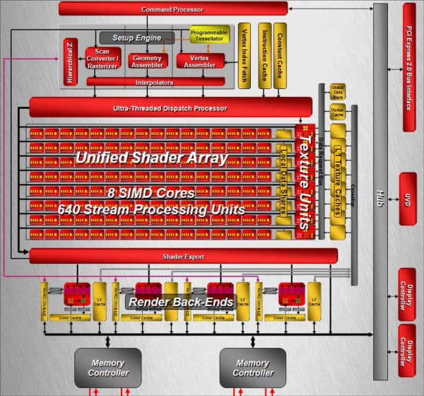 - 8 SIMD ядер, включающих 640 скалярных ALU для расчётов с плавающей точкой (целочисленные и плавающие форматы, поддержка FP32 и FP64 точности в рамках стандарта IEEE 754)