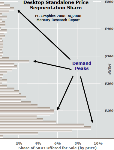 Совсем недавно и AMD и Nvidia выпустили новые модели для верхнего ценового диапазона. Но ведь основная масса покупаемых видеокарт явно не стоит по $250 и выше. Тем более — в жёстких условиях продолжающегося непростого экономического положения во всём мире. А задавался ли наш читатель вопросом, к какому ценовому диапазону принадлежат наиболее массовые видеокарты? Компания AMD приводит такой график, основанный на исследованиях известной компании Mecrury Research, и показывающий доли рынка в последнем квартале прошлого года, занятые дискретными видеокартами разных ценовых сегментов: