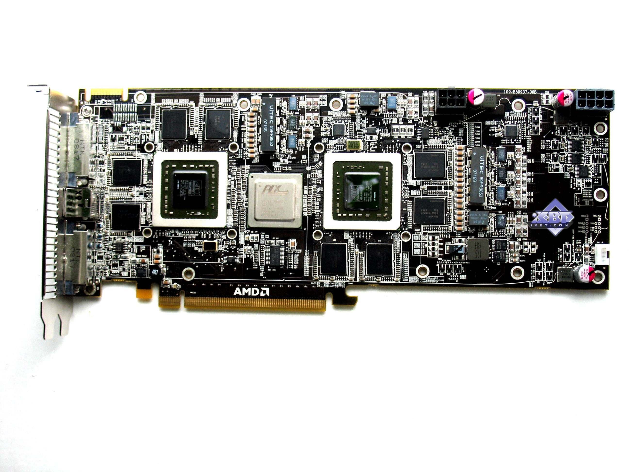 Очевидно, что концепция дизайна перекочевала из 3870 Х2, изменения коснулись лишь особенностей памяти DDR5, и более сильных требований к силовой цепи. На плате установлен новый мост PEX от PLX Technologies, обеспечивающий внутренний CrossFire режим между ядрами.