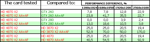 Очевидно, что продукт теоретически может быть в 2 раза сильнее 4870, но фактически это от 1,5 до 1,8 раза, иногда меньше. Да, глядя на графики и прекрасные цифры приростов, надо иметь в виду, что у двухпроцессорных карт (хоть от AMD, хоть от Nvidia) есть большой недостаток: программное управление распределения работы между процессорами, поэтому степень отлаженности и производительность в той или иной игре целиком зависит от того, как тщательно поработали над соответствующим драйвером программисты. И есть много игр, где эти все супермощные двухпроцессорные гиганты демонстрируют низкую скорость, а что хуже всего, еще и лаги, дергания. Что бывает, когда какой-то процессор освободился и получает легкую задачу, а второй занят капитально, и скорость проседает. И получается огромный разброс мгновенного FPS (от 5 до 60 или выше). Понятно, что визуально это будет выглядеть, как лаги и задержки, что некоторых геймеров может сильно раздражать.