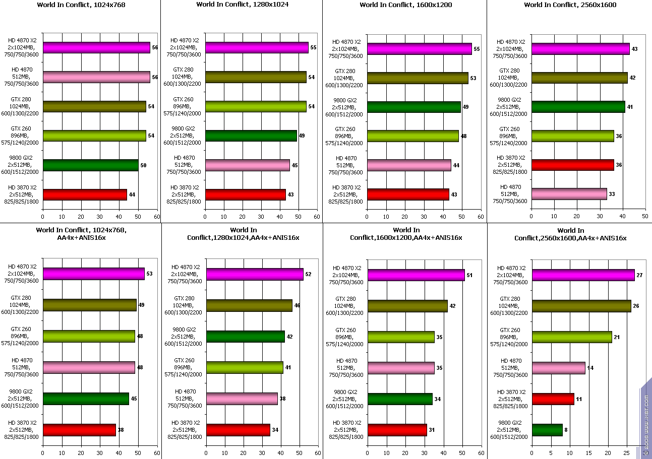- World In Conflict 1.007 (Massive Entertainment/Sierra) — DirectX 10.0, shaders 4.0, После вхождения в игру вызвать опцию настроек, выбрать раздел по графике и нажать на кнопку с тестом. Тестирование проводилось при максимальном качестве (very high с регулировкой АА и АФ).