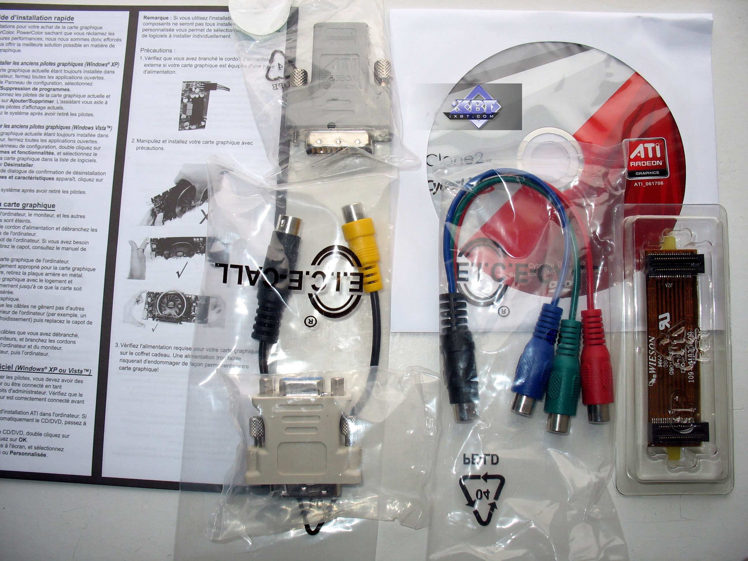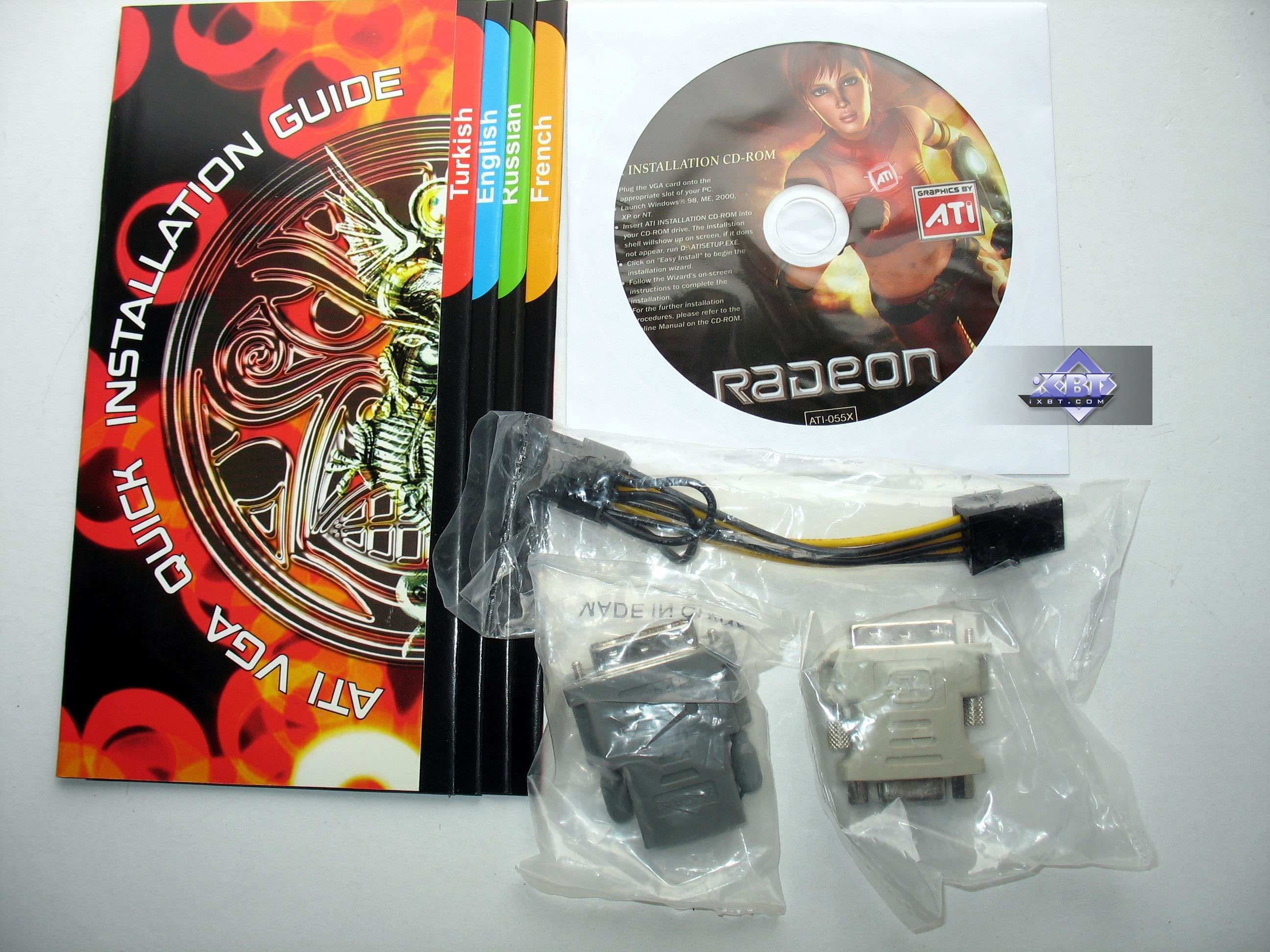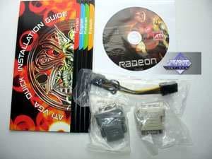 Базовый комплект поставки должен включать в себя: руководство пользователя, диск с драйверами и утилитами, переходник-адаптер DVI-to-VGA, DVI-to-HMDI адаптер, адаптер компонентного вывода (TV-out), а также разветвители внешнего питания и мост CrossFire. Далее мы покажем, что предлагается к каждой карте дополнительно.