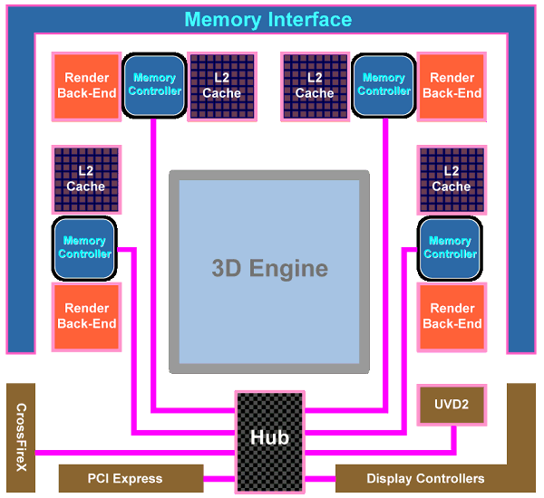 Из других важных изменений в чипе — смена ранее широко разрекламированной, но так и не ставшей удачной, кольцевой шины памяти (ring bus) на архитектуру с центральным хабом. В RV770 контроллеры памяти расположены по краям чипа, рядом с основными потребителями трафика, а хаб распределяет потоки данных между уже упомянутыми блоками, а также PCI Express, CrossFireX, UVD2, контроллерами вывода.