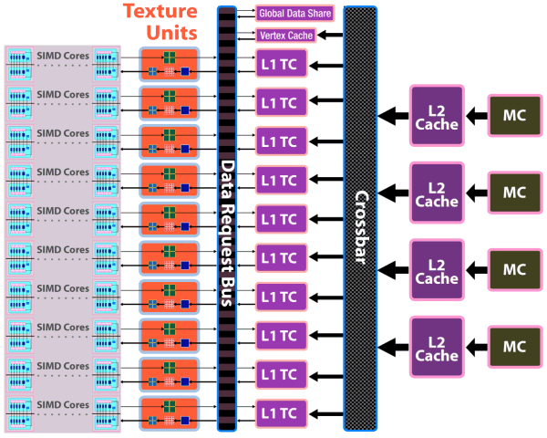 В чипе применен новый дизайн блоков кэширования: вершинный кэш отдельный, кэш второго уровня привязан к четырём 64-битным каналам памяти, L1 кэши хранят уникальные данные для каждого блока SIMD, что увеличивает эффективность кэширования. Также увеличена и пропускная способность: до 480 ГБ/с для текстурного кэша первого уровня, до 384 ГБ/с между кэшем L1 и L2.