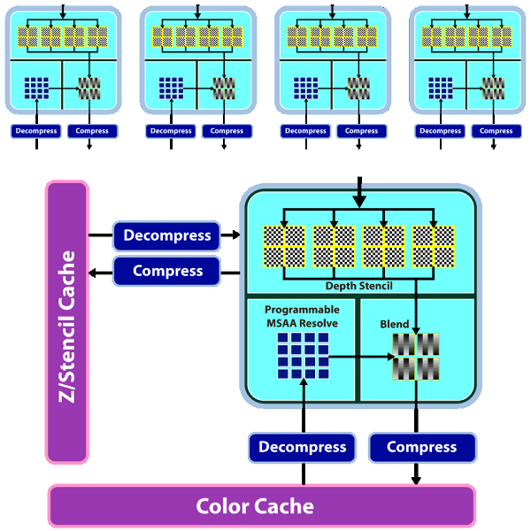 Все вышеуказанные изменения в текстурных блоках и кэшировании привели к тому, что текстурирование у RV770, судя по feature тесту из 3DMark Vantage, в два раза более эффективно, чем у конкурирующих чипов Nvidia (и G92 и GT200). Рассмотрим схему блоков ROP: