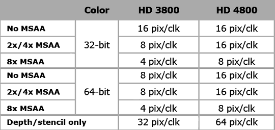 Как видно на схеме, качественных изменений в блоках ROP не так много. Зато, хоть блоки ROP и остались в том же количестве, что и в RV670, теперь они умеют обрабатывать за такт вдвое большее количество пикселей в большинстве случаев, что особенно важно при включенном MSAA. Теперь алгоритмы MSAA 2x и 4x вообще почти что «бесплатны», по крайней мере, с точки зрения работы ROP. Вот сравнительная таблица темпа записи пикселей во фреймбуфер в различных режимах: