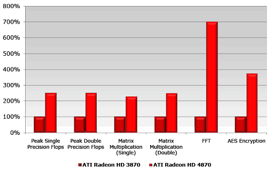 Компания AMD приводит такой график относительной производительности RV670 и RV770 в синтетических расчётных задачах. Средняя разница в скорости между двумя поколениями равна 2.5-3 раза (что примерно соответствует увеличенному числу потоковых процессоров), но максимальный прирост был получен в алгоритме быстрого преобразования Фурье (FFT) — разница в скорости составила семь раз. Почти в 4 раза ускорилось шифрование по алгоритму AES. Вот это уже — влияние изменений в архитектуре.