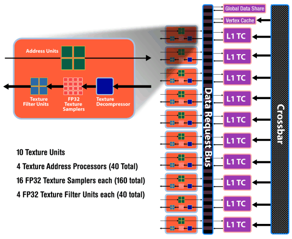 А вот блоки текстурирования изменились очень сильно, теперь они привязаны к SIMD, а их эффективность значительно улучшена. Проектировщики убрали выделенный пул TMU, известный по предыдущим поколениям чипов, реализовав решение, очень похожее на то, что мы видим у Nvidia, с блоками TMU, включенными в состав SIMD ядер.