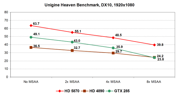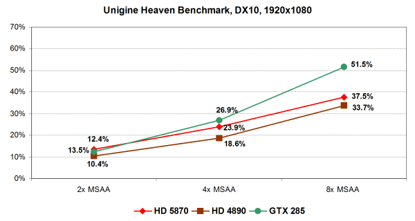 Впрочем, по сравнению с соперником в лице Geforce GTX 285 это падение чуть ниже в режиме MSAA 4x, и значительно ниже в MSAA 8x. Собственно, не секрет, что все нынешние видеокарты Nvidia очень сильно проигрывают именно в этом режиме с восемью выборками. И этот наш тест — лишнее тому подтверждение.