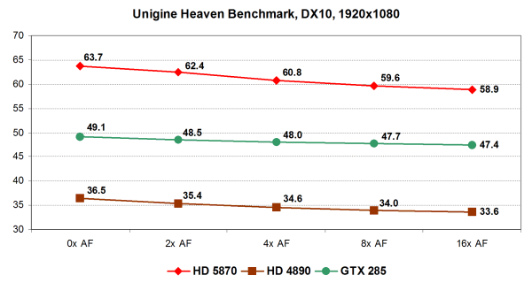 Но мы с вами исследовали только «качественную» сторону, обходя своим вниманием то, как изменилась производительность нового алгоритма текстурной фильтрации. И по сравнению с предыдущим поколением карт AMD, и по сравнению с Geforce GTX 285. Для этого рассмотрим производительность текстурной фильтрации в свежем бенчмарке Unigine Heaven: