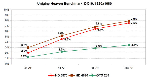С другой стороны, по эффективности алгоритм текстурной фильтрации у обеих видеокарт AMD явно уступает алгоритму Nvidia. Geforce GTX 285 теряет в скорости рендеринга на каждой ступени анизотропной фильтрации намного меньше, чем HD 5870 и HD 4890. Вероятно, часть этой разницы компенсируется режимом Quality с оптимизациями трилинейной фильтрации, однако именно такие настройки по умолчанию у Nvidia, и именно так во всех исследованиях сравниваются видеокарты.