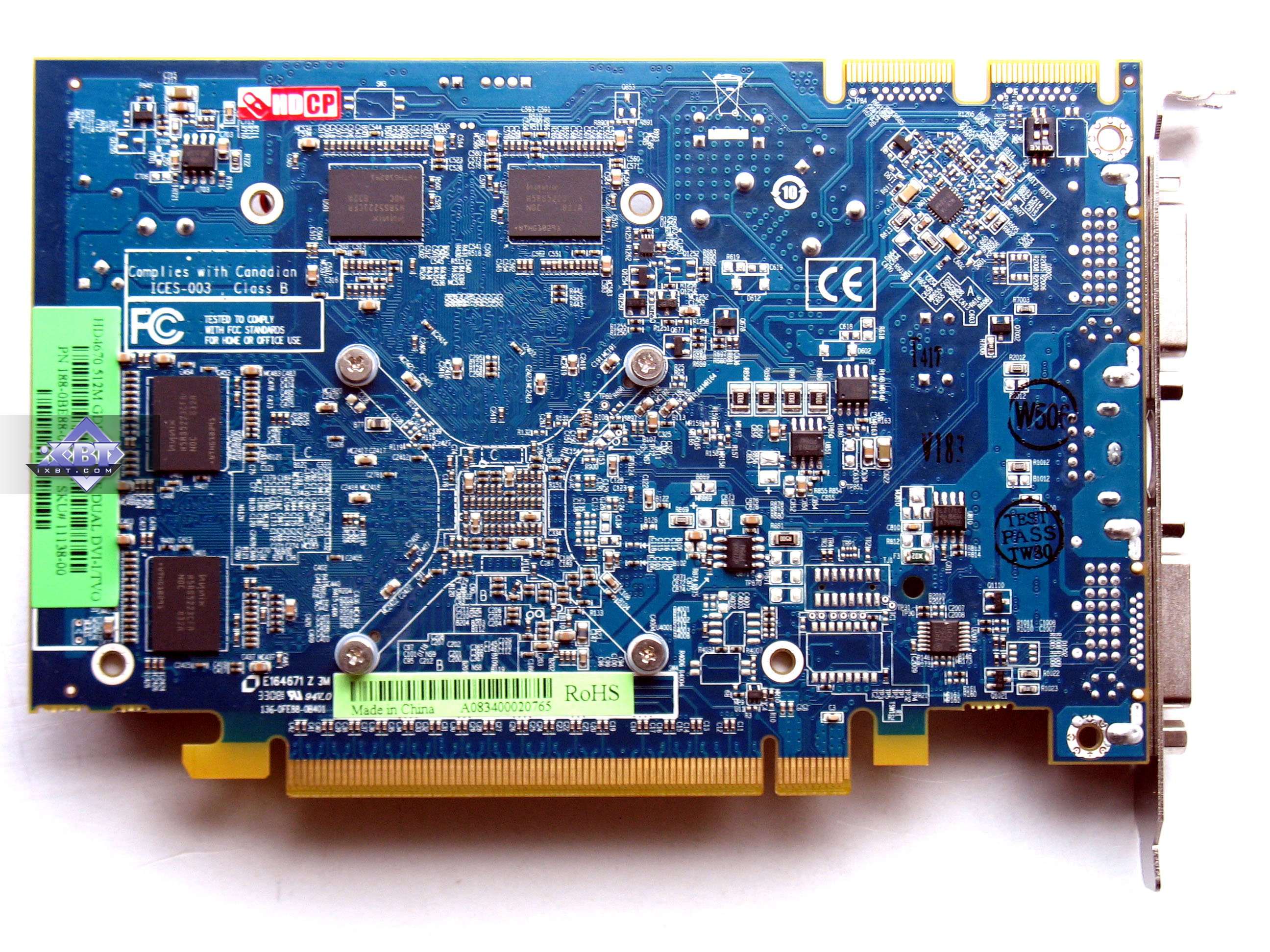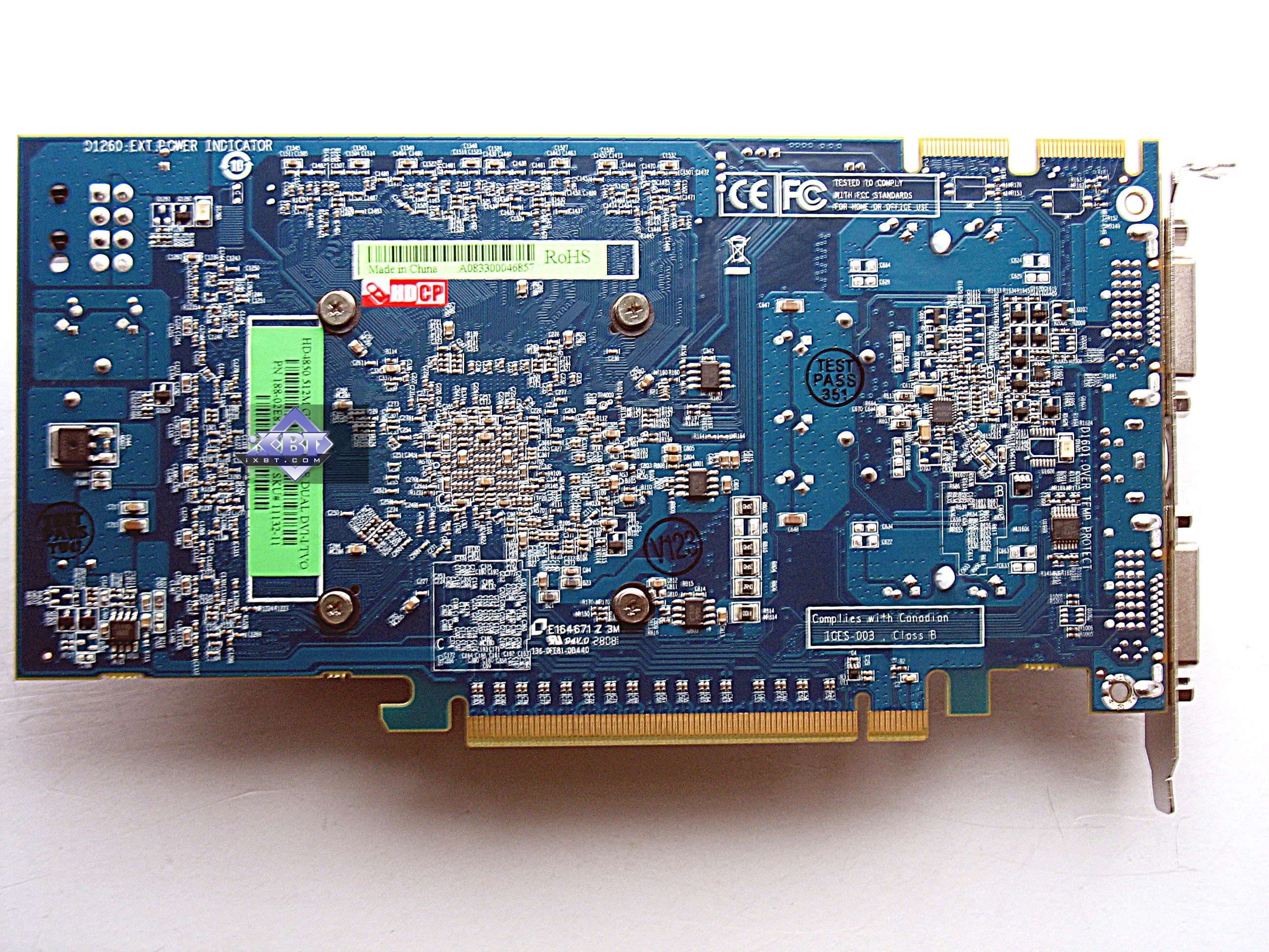 | Карта имеет 512 МБ памяти GDDR5 SDRAM, размещенной в 8 микросхемах на лицевой стороне PCB Микросхемы памяти Qimonda (GDDR5). Микросхемы рассчитаны на максимальную частоту работы в 1000 (4000) МГц. | ![]() |