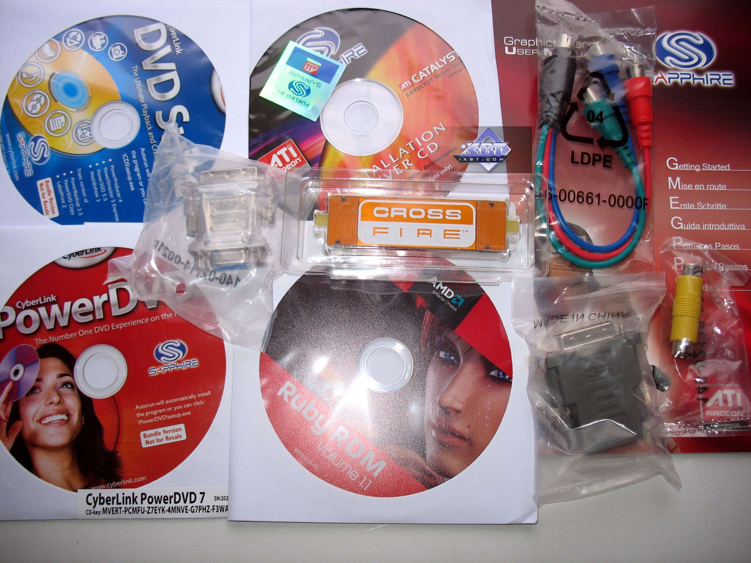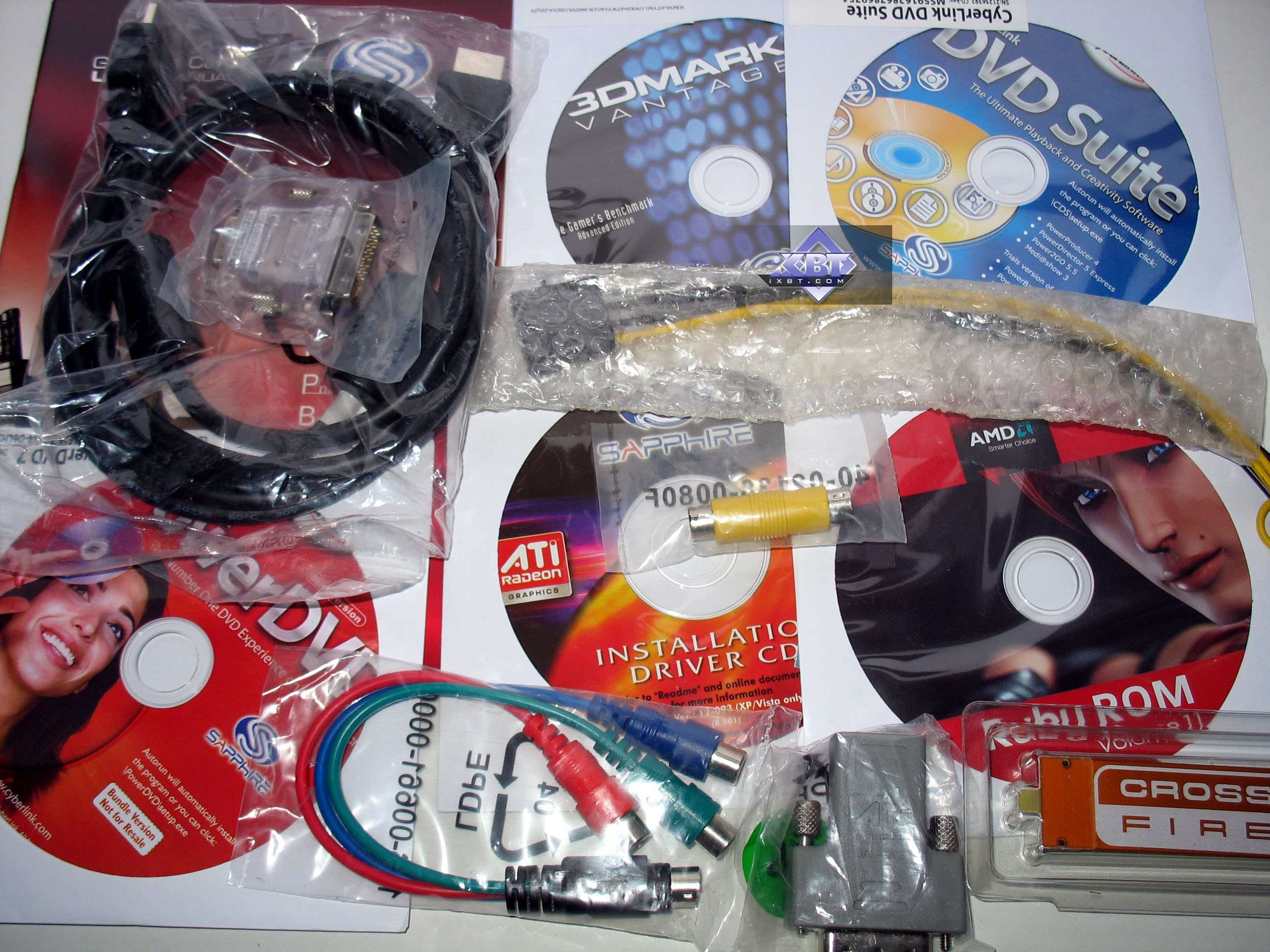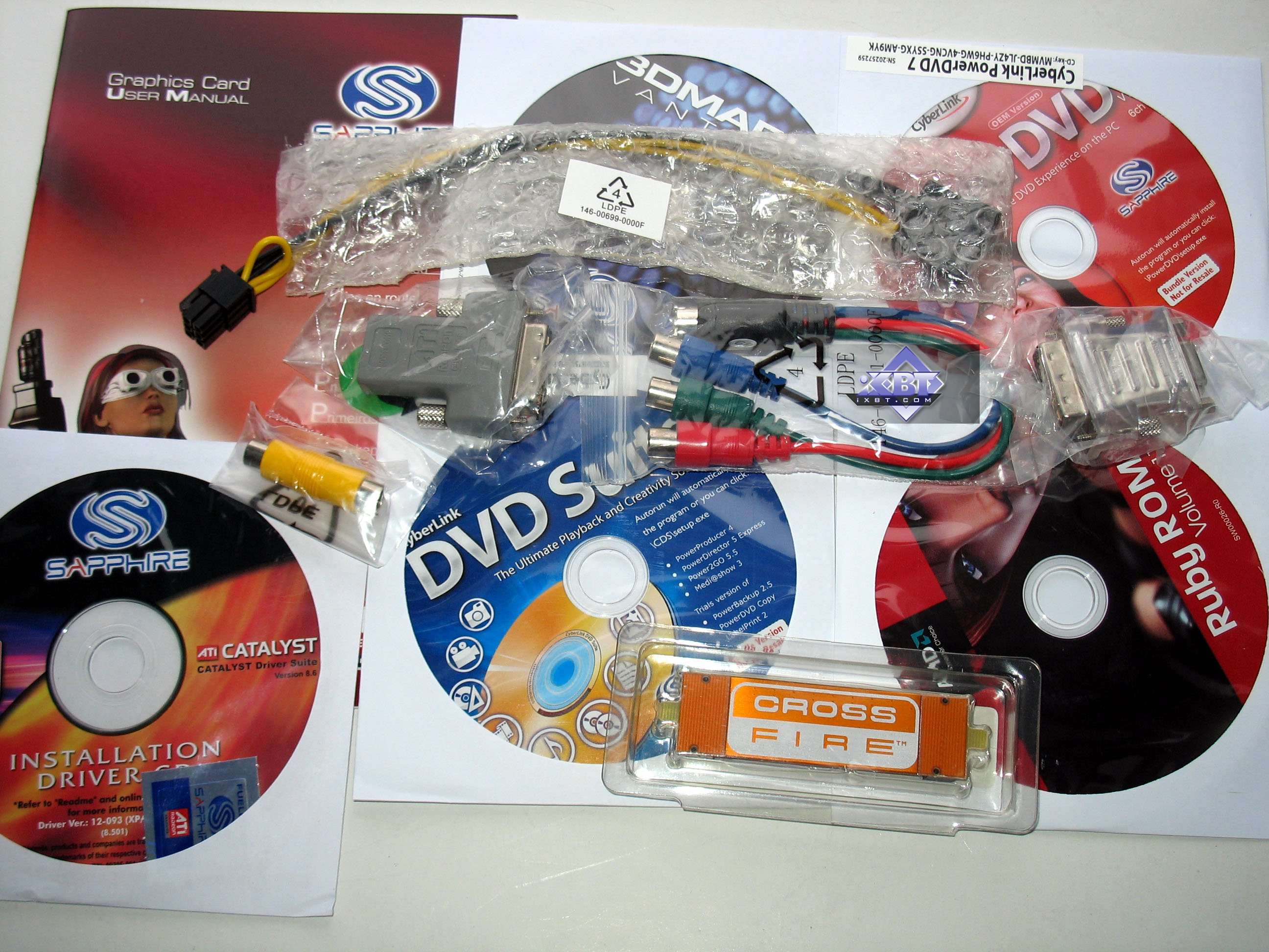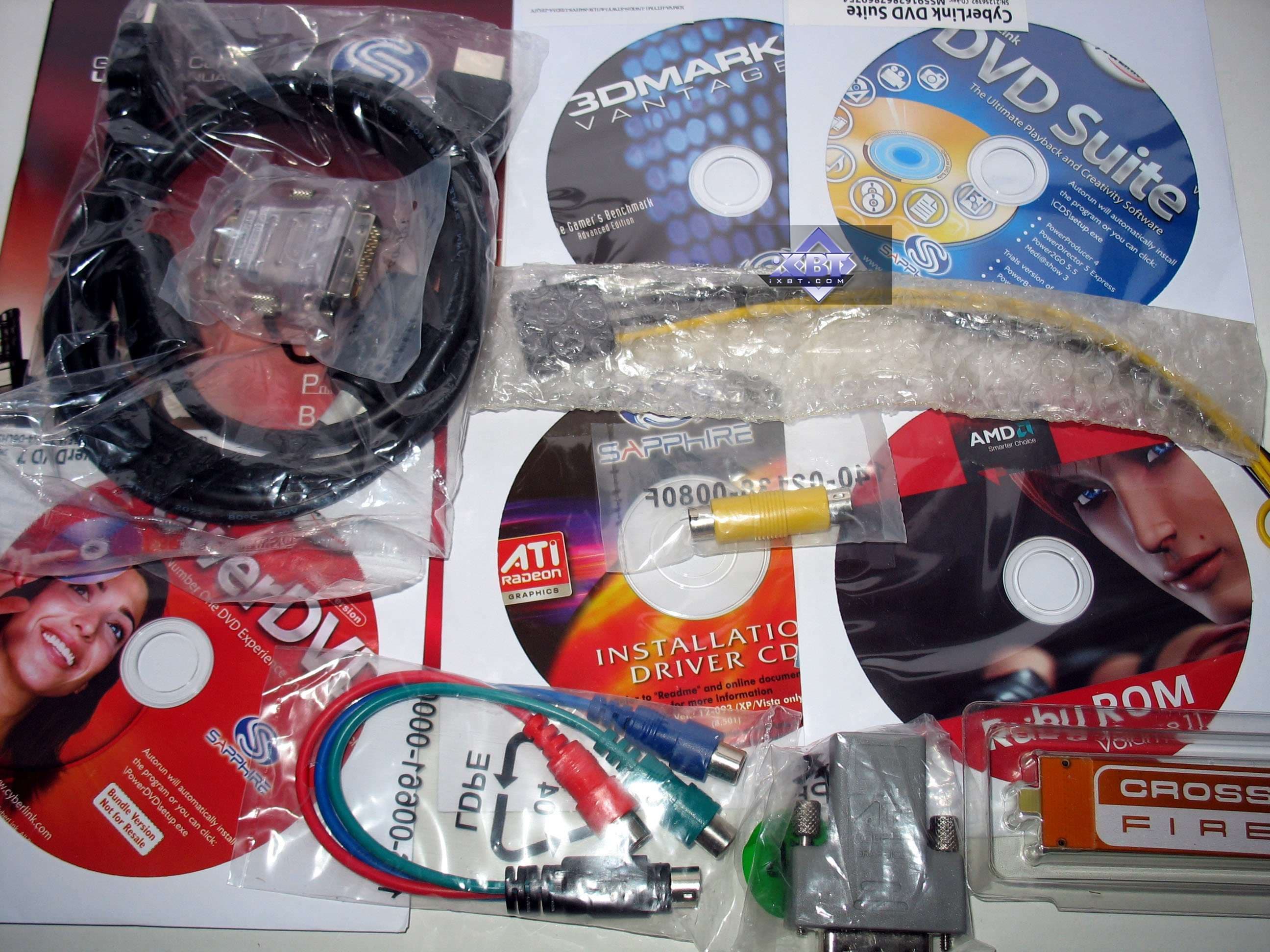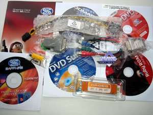 Базовый комплект поставки должен включать в себя: руководство пользователя, диск с драйверами и утилитами, переходник-адаптер DVI-to-VGA, DVI-to-HMDI адаптер, адаптер компонентного вывода (TV-out), а также разветвители внешнего питания и мост CrossFire. Далее мы покажем, что предлагается к каждой карте дополнительно.
