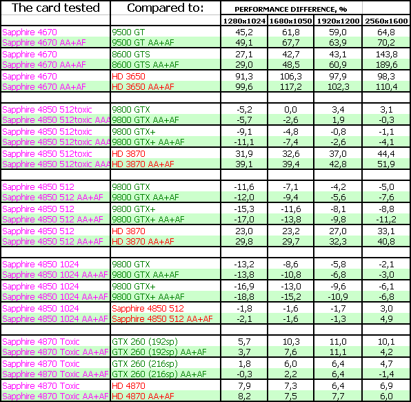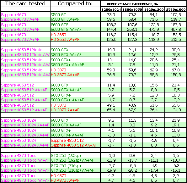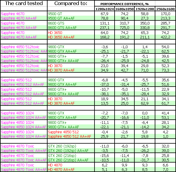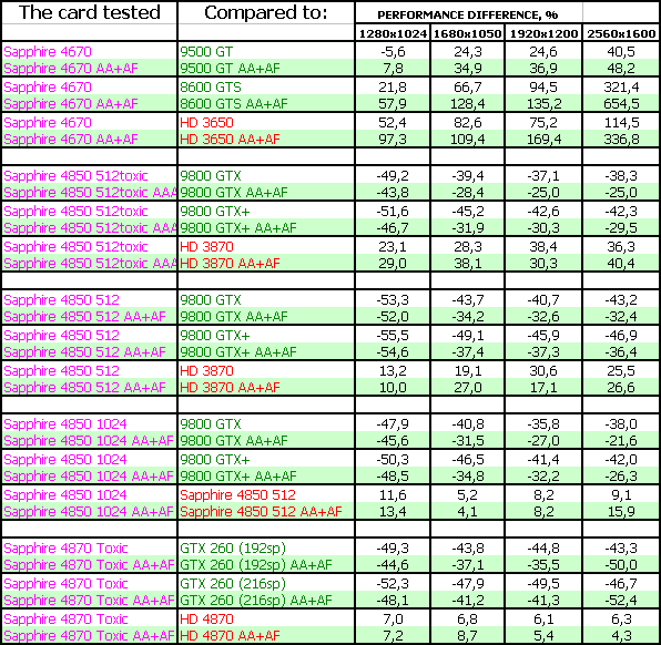 Sapphire RADEON HD 4850 1024MB PCI-E — как мы видим, увеличение объема памяти в 2 раза такому продукту почти не дает никаких дивидендов, более того, комплектация карты памятью с более высокой латентностью, приводит к тому, что продукт на 1-2% отстает от 512 МБ аналогов. Использование узкого и закрытого кулера в данном случае мало дает плюсов (если не считать толщины кулера в 1 слот), хотя это уже дело вкуса. Комплект поставки так же отличный.