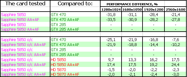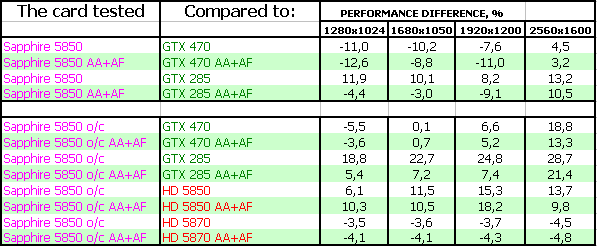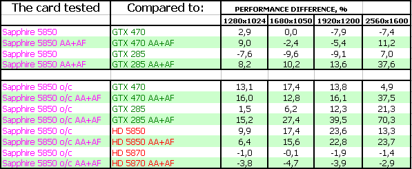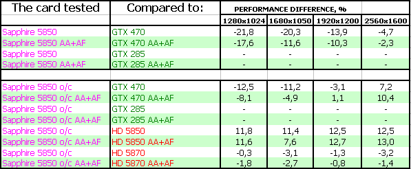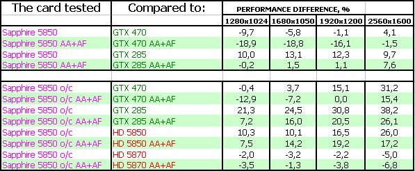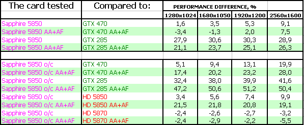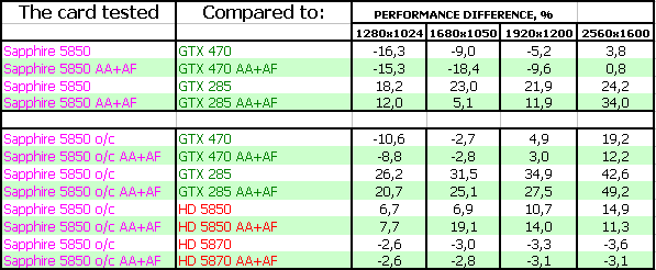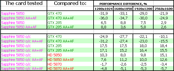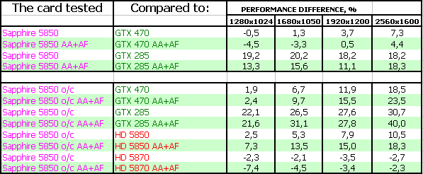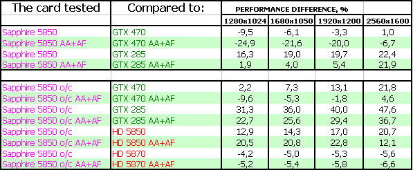Кстати, было очень интересно проанализировать - что дает урезание ядра по блокам, ведь если ядра 5870 и 5850 работают на одинаковых частотах и имеют одну и ту же ПСП, то разница в производительности будет складываться исключительно из-за меньшего количества потоковых процессоров, текстурных модудей у 5850 относительно 5870. И как мы видим, урезание не привело к существенному падению скорости, наверно поэтому приняли решение о снижении частот работы, чтобы сделать различие в производительности более существенным, а также получить больший выход 5850.