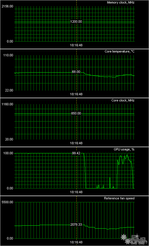 Теперь следует рассказать о том, как мы тестировали данный продукт. Дело в том, что само по себе незначительное штатное поднятие частот мало что дает (не выше 5% производительности). А вот попробовать прогнать такой продукт с уникальной СО на частотах 5870 - это было бы интересно. Что мы и сделали. Поэтому в данном материале дальше мы будет исследовать работу этой карты на высоко поднятых частотах, на которых она работала успешно и стабильно. Также мы провели исследование температурного режима с помощью утилиты RivaTuner (автор А.Николайчук AKA Unwinder) и получили следующие результаты: