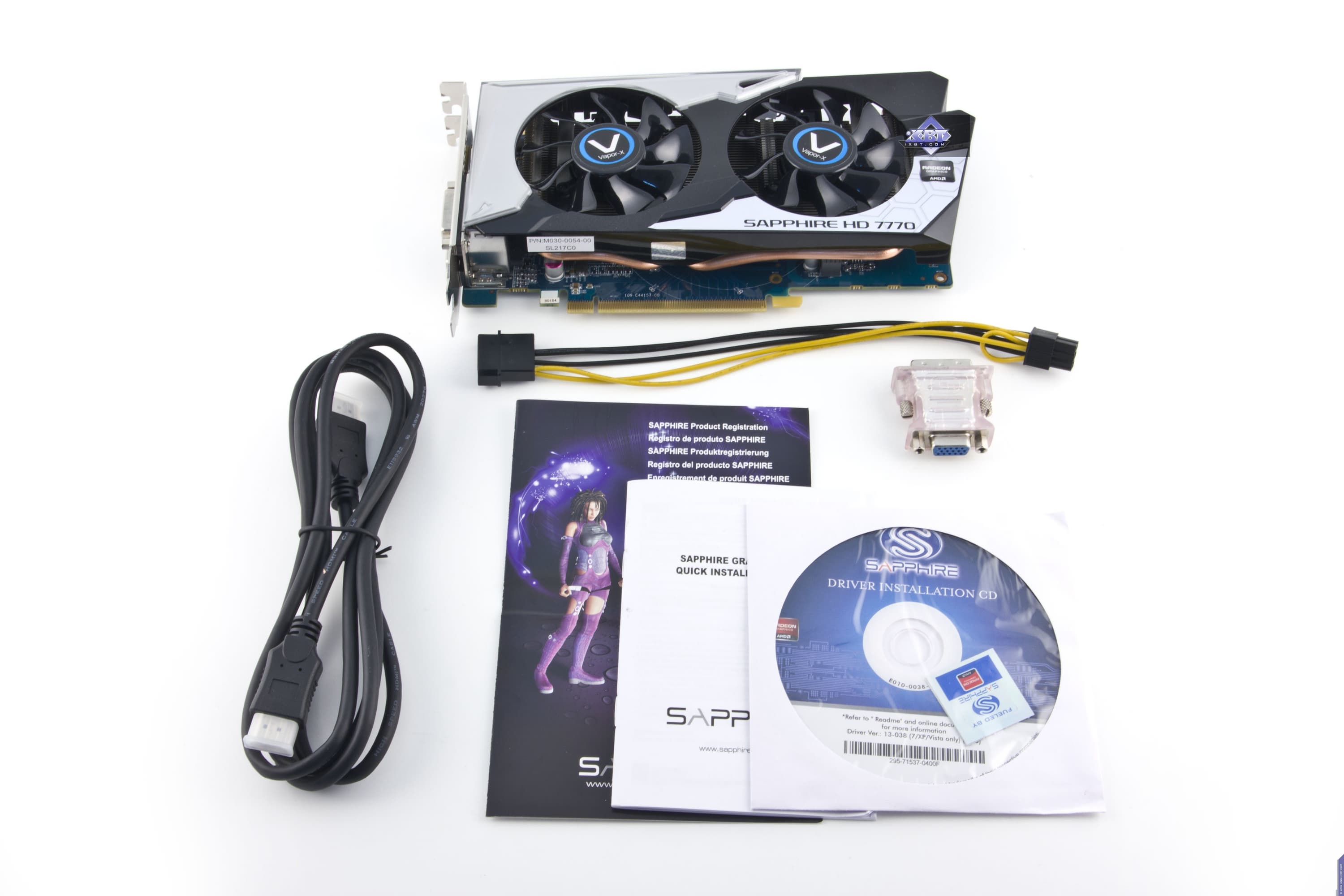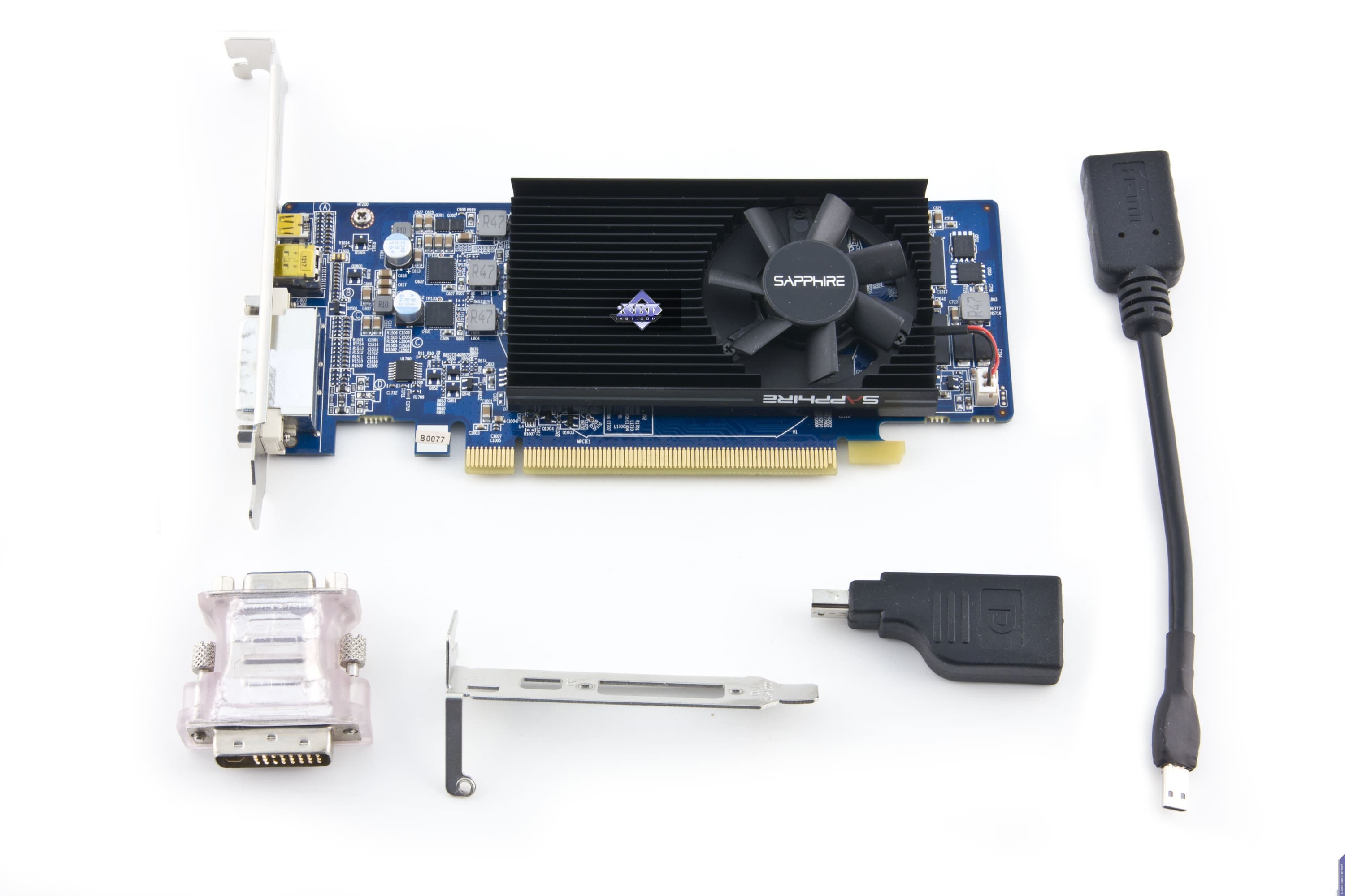 Базовый комплект поставки должен включать в себя: руководство пользователя, диск с драйверами и утилитами, мост CrossFire, а для Sapphire Radeon HD 7750 Low Profile еще и адаптеры с мини-форматов на полные.