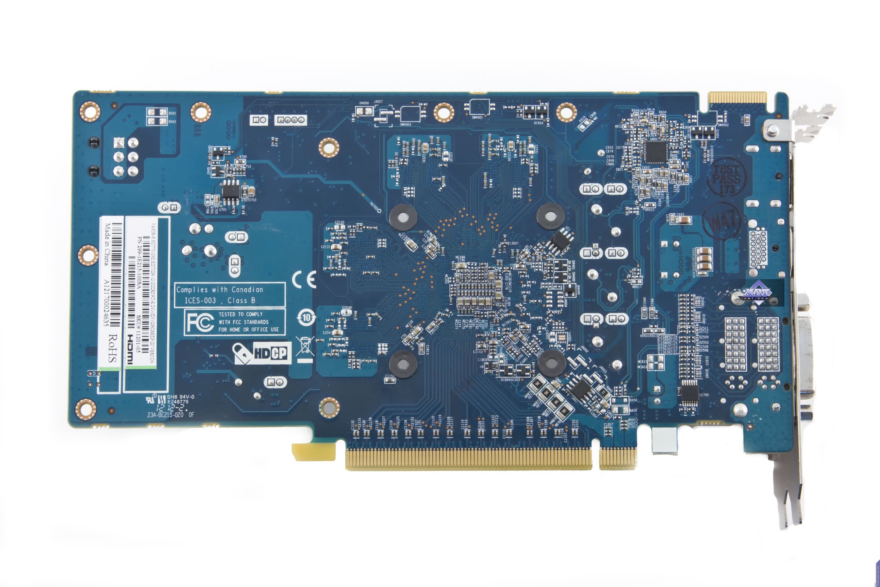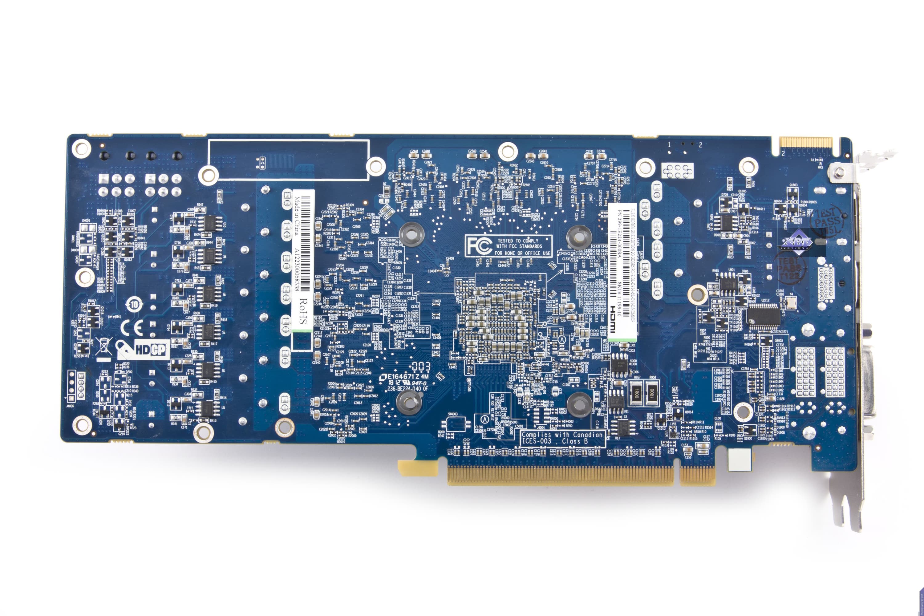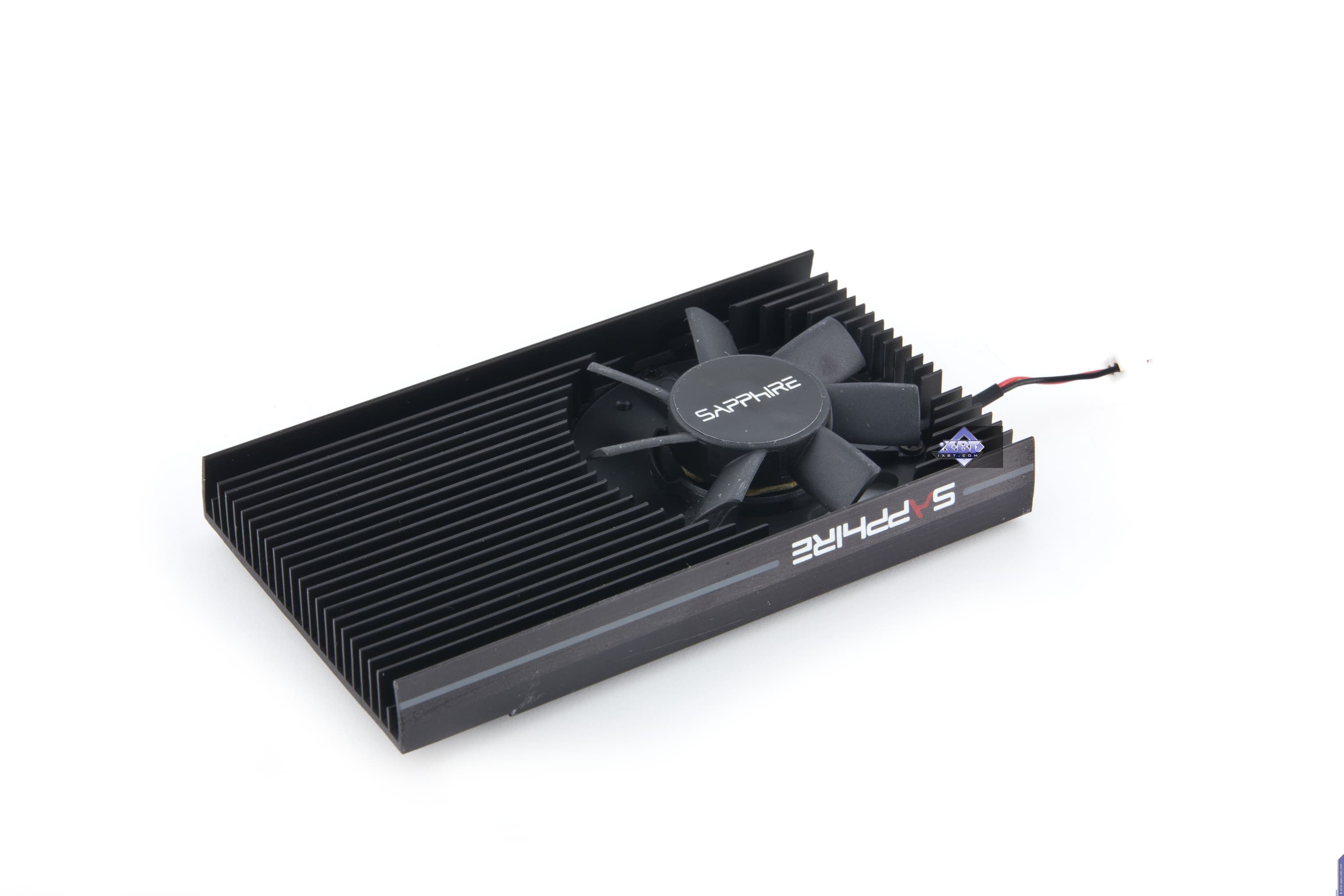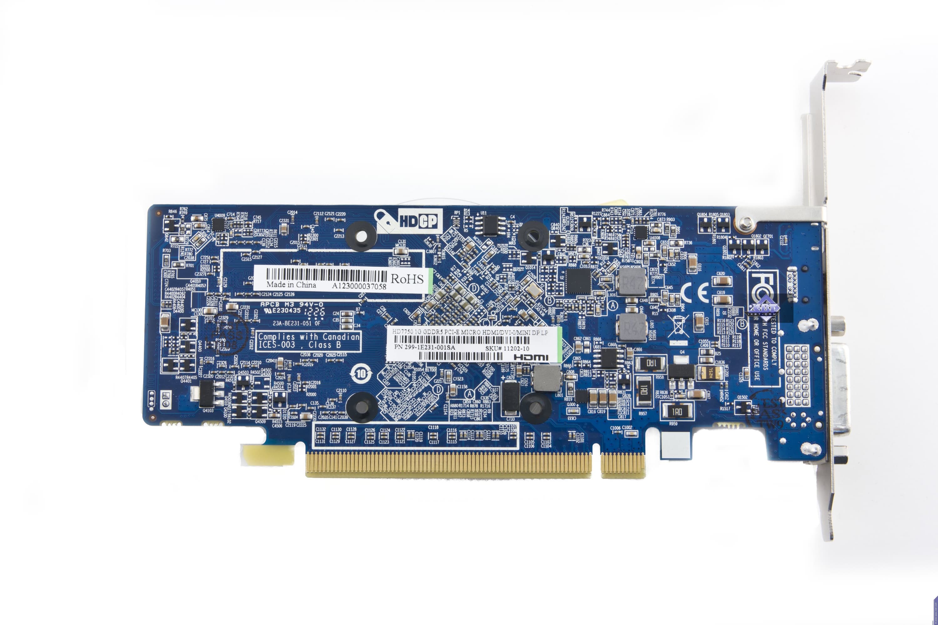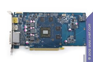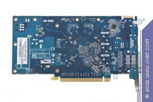 Изделие на основе 7750 требует особого внимания. Перед нами сильно переработанный и адаптированный под узкие (слим) корпуса или баребоны ускоритель форм-фактора Low Profile. Разумется, из-за сильно измененных физических соотношений и размеров PCB вся компановка является уникальной, и сравнение с референс-картой получается очень условным. По сути их объединяет одно и то же ядро, одинаковое количество микросхем памяти и схема блоков питания: 2 фазы на ядро и 1 фаза на микросхемы памяти. Впрочем, и по набору гнезд вывода есть сходство, правда у продукта Sapphire гнезда HDMI и DP представлены в мини-форматном виде (из-за маленькой высоты PCB). Ускоритель не требует дополнительного питания.