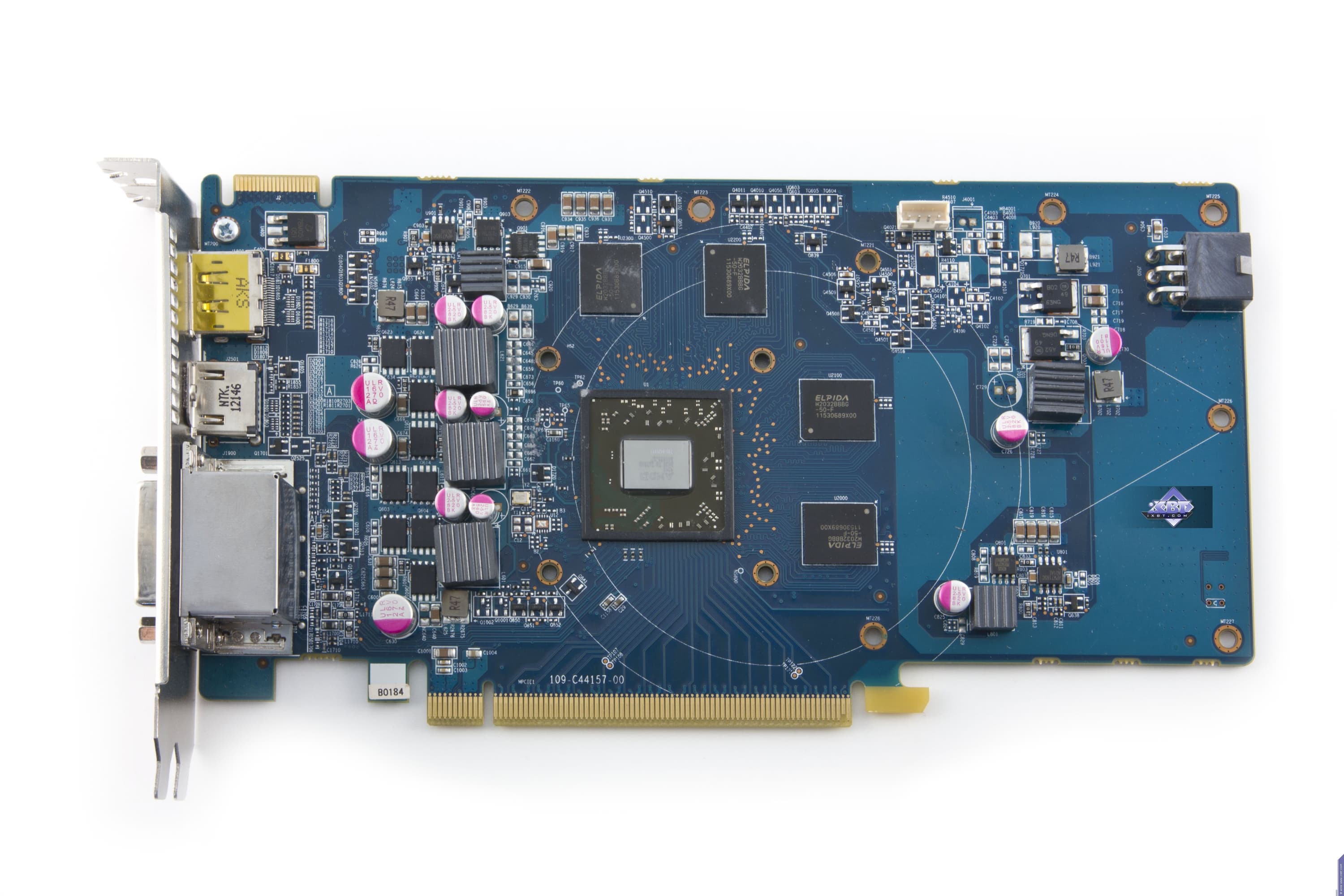 Карта имеет 1024 МБ памяти GDDR5 SDRAM, размещенной в 4 микросхемах на лицевой сторонe PCB. Микросхемы памяти Elpida (GDDR5). Микросхемы рассчитаны на максимальную частоту работы в 1250 (5000) МГц. | ![]() |