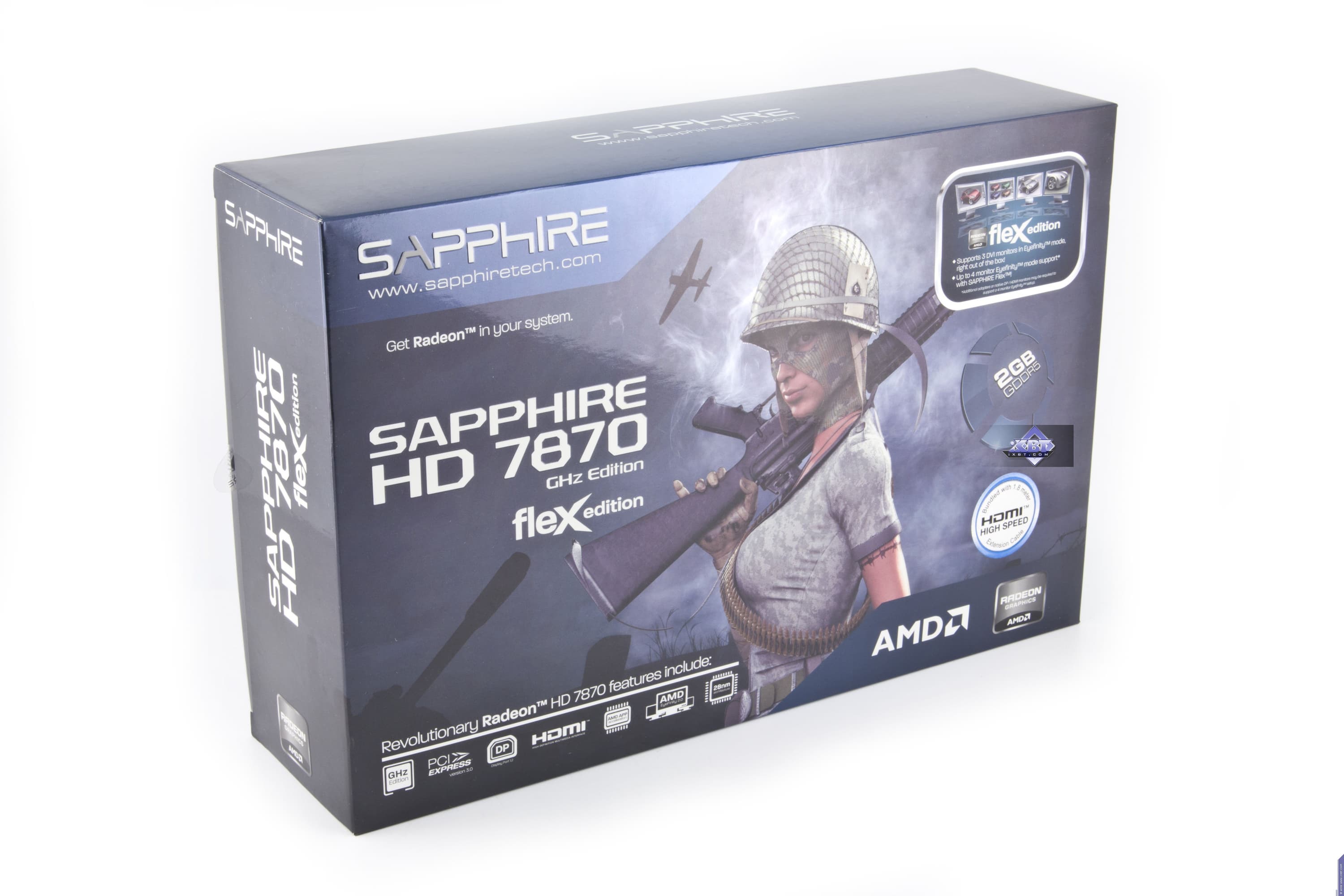 Sapphire Radeon HD 7870 GHz Flex Edition 2048 МБ 256-битной GDDR5 PCI-E — отличный вариант средне-топового продукта, имеет преимущества не только по скорости в 3D (мы помним, что разогнанные вариации 7870 легко обходят по скорости более дорогой Radeon HD 7950), а также дает возможность вывода картинки одновременно на 4 монитора. Конечно, это для 3D не так востребовано (все же разрешение получится очень высоким, и ускоритель попросту не выдаст приемлемую скорость), но для каких-то иных целей в 2D это может быть очень даже полезным.
