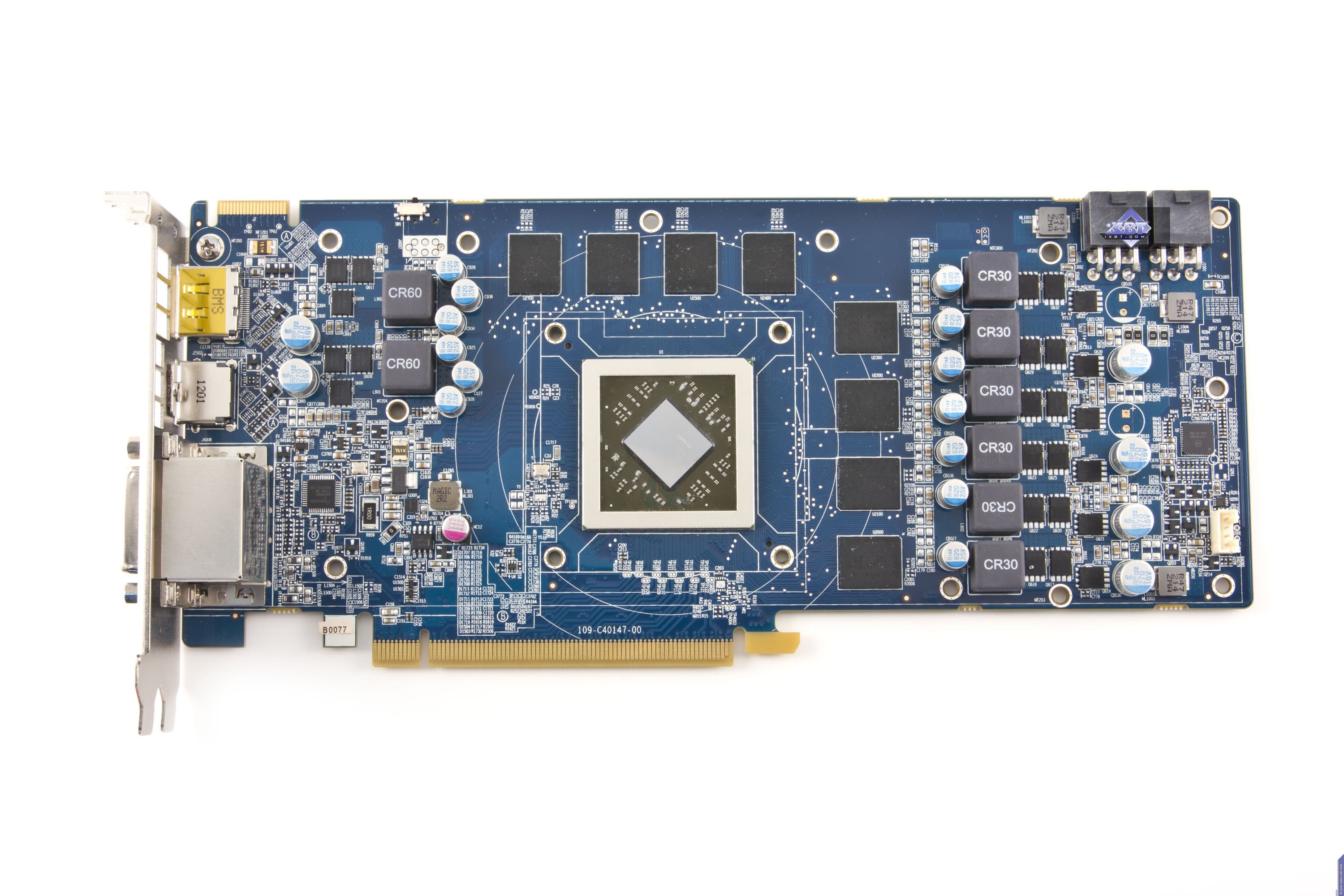 Карта имеет 3072 МБ памяти GDDR5 SDRAM, размещенной в 12 микросхемах на лицевой сторонe PCB. Микросхемы памяти Hynix (GDDR5). Микросхемы рассчитаны на максимальную частоту работы в 1400 (5600) МГц. | ![]() |