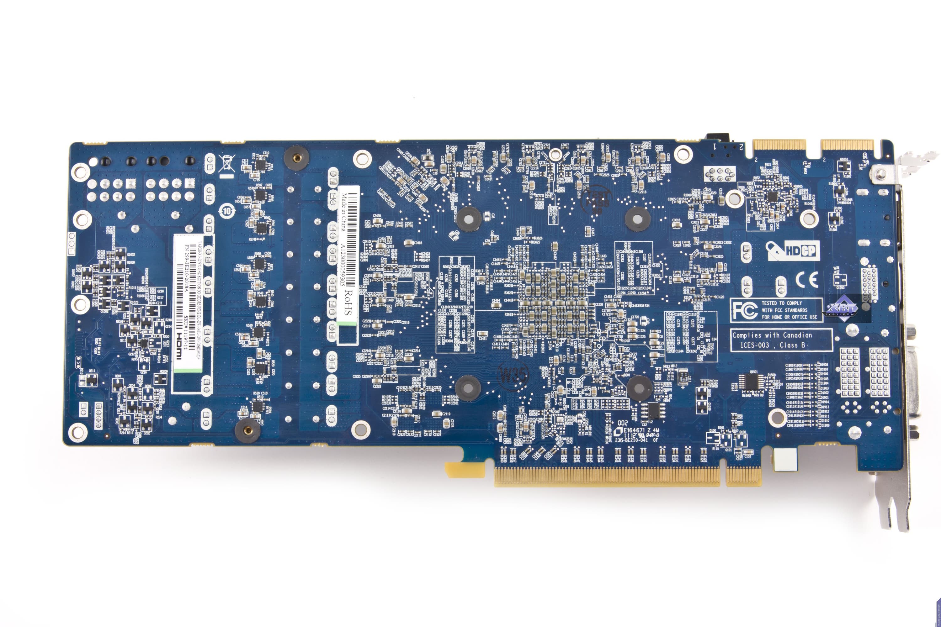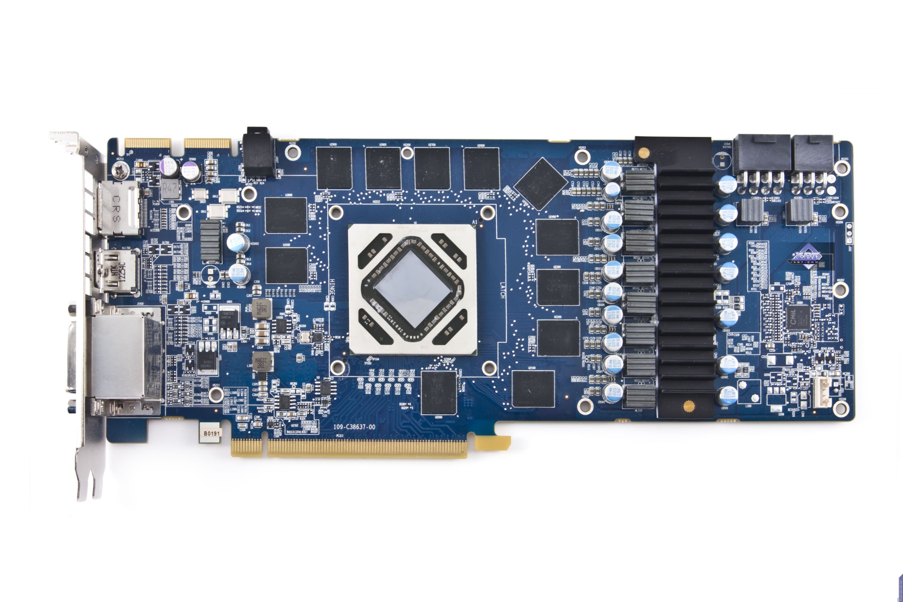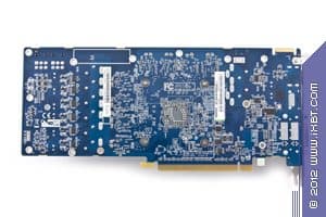 У 7870 также сильно переработана PCB, как следствие, блок питания перекочевал на хвостовую часть и стал 6-фазным вместо пятифазной схемы питания у референс-карты. Как и у предыдущего продукта, изменен набор гнезд вывода: появилось два гнезда DVI по аналогичной схеме. Точно так же вместо двух DisplayPort в мини-формате мы видим 1 гнездо DP, но в полноформатном виде. Еще имеется и HDMI. Следует заметить, что суффикс Flex-Edition у Sapphire означает то, что PCB получила дополнительный набор логики по выводу на мониторы, и потому ускоритель способен выводить картинку одновременно уже на 4 монитора. Если использовать нужные адаптеры-переходники DP-to-DVI, HDMI-to-DVI, то мы можем подключить 4 одинаковых монитора с DVI (надо лишь учитывать ограничение Single-Link у одного из гнезд DVI). Ускоритель требует дополнительного питания в виде двух 6-пиновых гнезд.