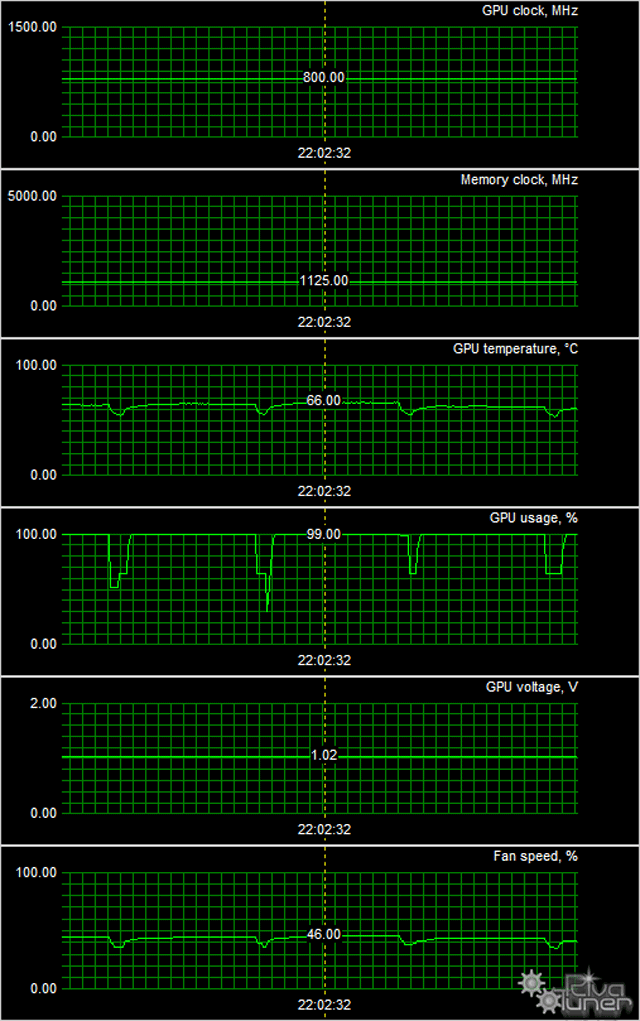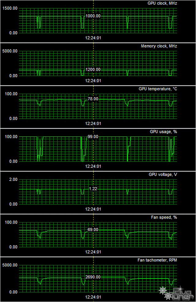 Мы провели исследование температурного режима с помощью утилиты MSI Afterburner (автор А. Николайчук AKA Unwinder) и получили следующие результаты: