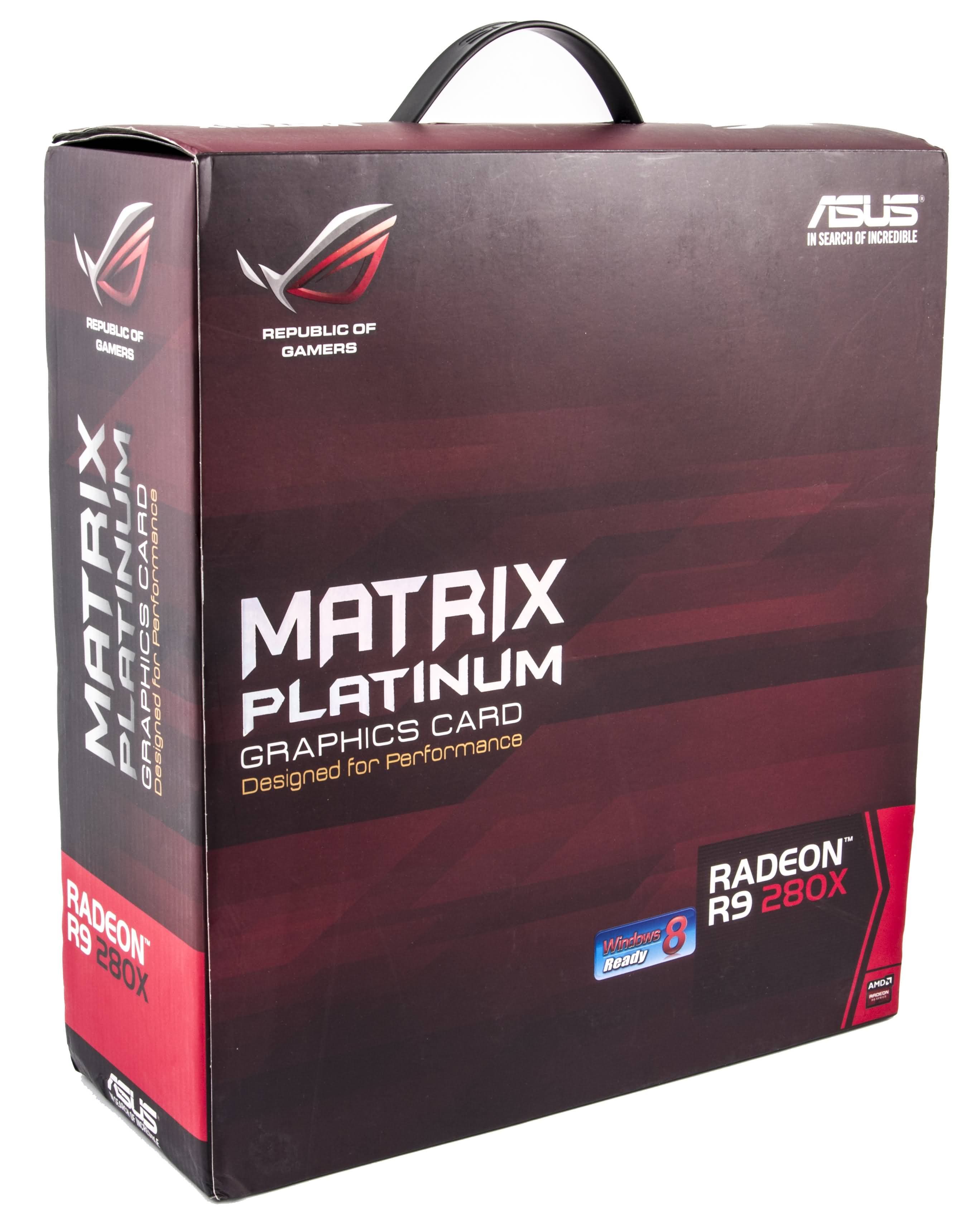 Asus Matrix Platinum Radeon R9 280X 3072 МБ 384-битной GDDR5 PCI-E — отличное решение для любителей разгона (наш экземпляр «погнался» до уровня 1220 МГц по ядру и 7200 МГц по памяти, работая при этом стабильно и почти бесшумно!), а также для всех, кто хочет мощный и стильный 3D-ускоритель в пределах цены 300—380 долларов (любителям моддинга может к тому же понравиться «цветовая сигнализация» карты, меняющая цвет в зависимости от нагрузки на ядро).