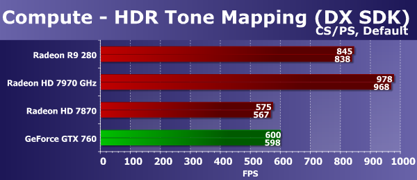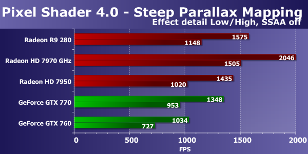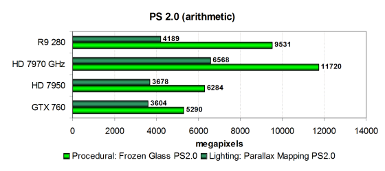 Во втором подтесте с более сложными попиксельными расчетами новинка уступила Radeon HD 7970 GHz уже куда больше. И преимущество над Geforce GTX 760 никуда не делось, ведь эффективность выполнения таких математических вычислений в пиксельных шейдерах у чипов архитектуры GCN заметно выше, чем у Kepler.