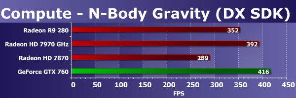 Второй тест вычислительных шейдеров также взят из Microsoft DirectX SDK, в нем показана расчетная задача гравитации N тел (N-body) — симуляция динамической системы частиц, на которую воздействуют физические силы, такие как гравитация.