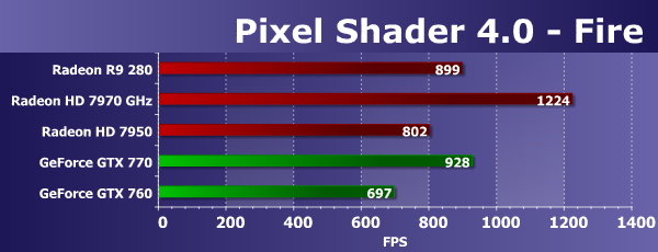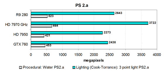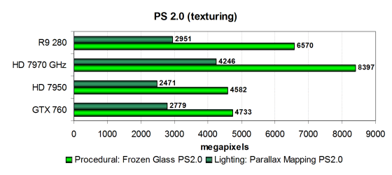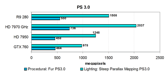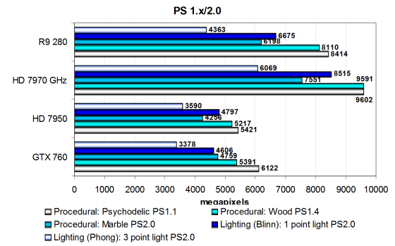 Производительность современных видеокарт в этих задачах ограничена скоростью текстурирования или филлрейта, и в данном случае можно сказать лишь то, что вышедшая в марте видеокарта AMD Radeon R9 280 в этом сравнении уступает только HD 7970 GHz и заметно опережает оригинальную версию Radeon HD 7950. То же самое касается и прямого конкурента в виде Geforce GTX 760, плата AMD явно быстрее в подобных задачах. Посмотрим на результаты более сложных пиксельных программ промежуточных версий: